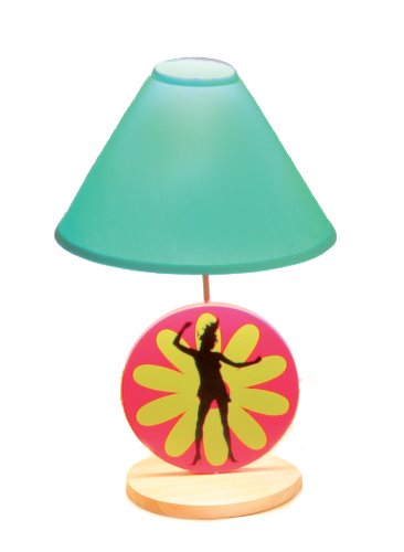 Product Description Our Flower Power lamp has a girl silhouette dancing against a retro style pink and lime green daisy. 18" high. Natural finish solid wood base. Aqua lampshade. 0
