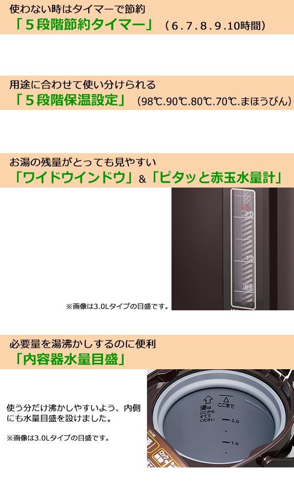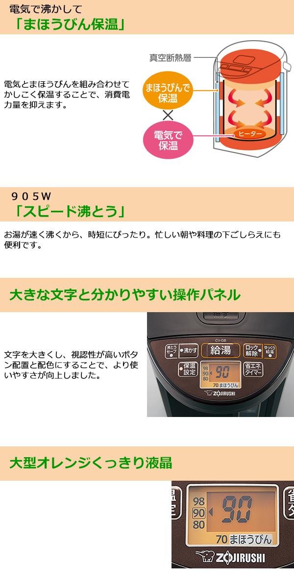 電気で沸かしてまほうびんで保温する電気まほうびん。905Wの「スピード沸とう」でお湯が速く沸きます。シニアの方にも見やすいように、文字サイズを大きくし、大型化したオレンジくっきり液晶を採用することで、操作しやすくなりました。 |