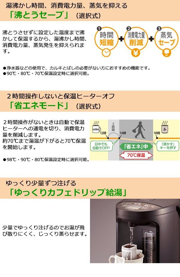 | 電気で沸かしてまほうびんで保温する電気まほうびん。905Wの「スピード沸とう」でお湯が速く沸きます。シニアの方にも見やすいように、文字サイズを大きくし、大型化したオレンジくっきり液晶を採用することで、操作しやすくなりました。 |