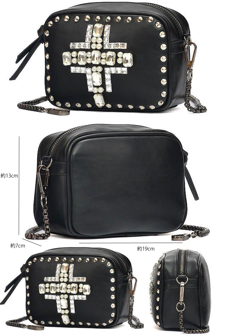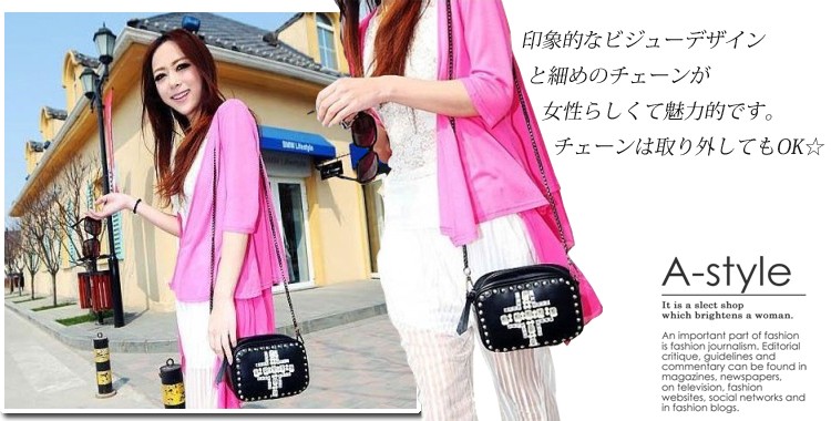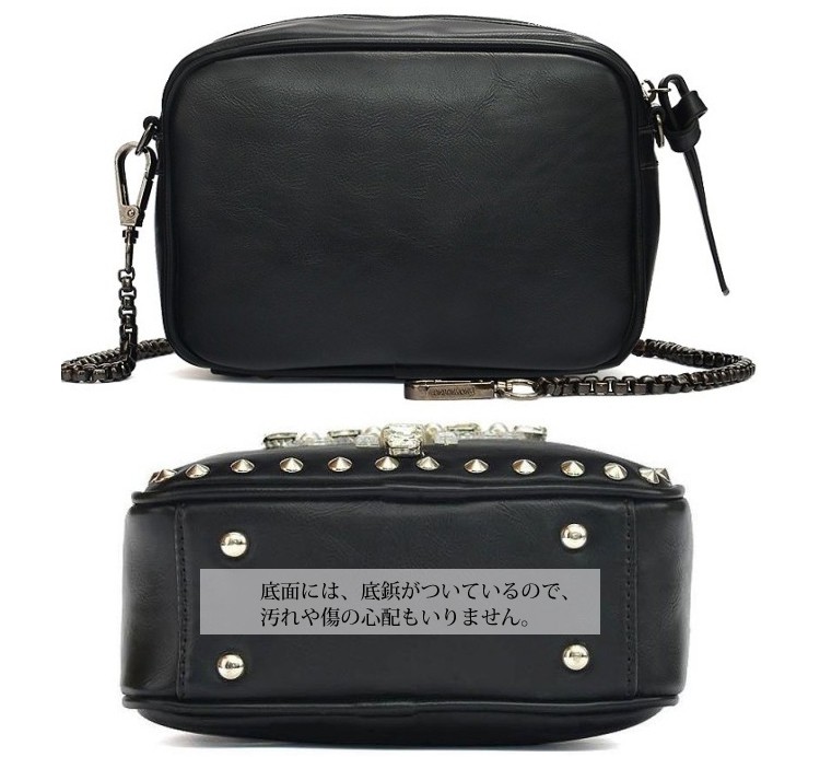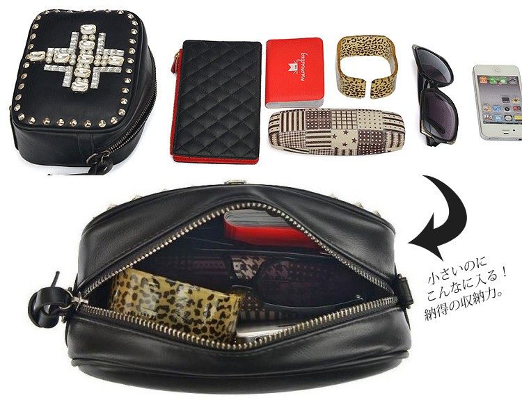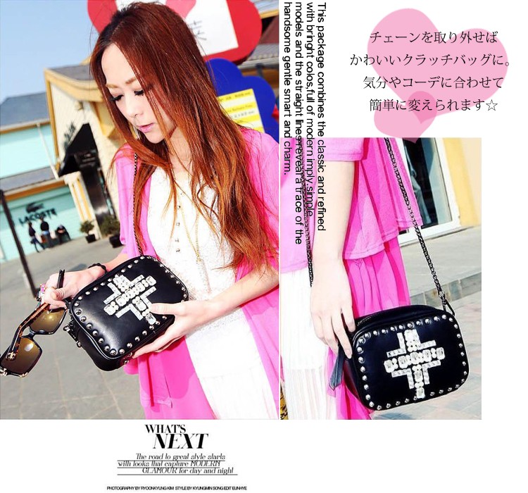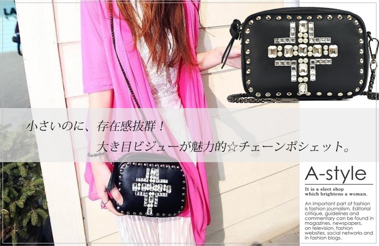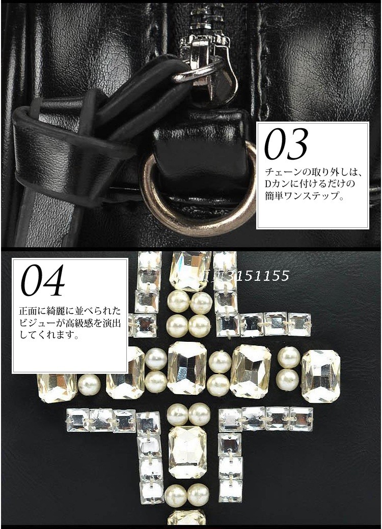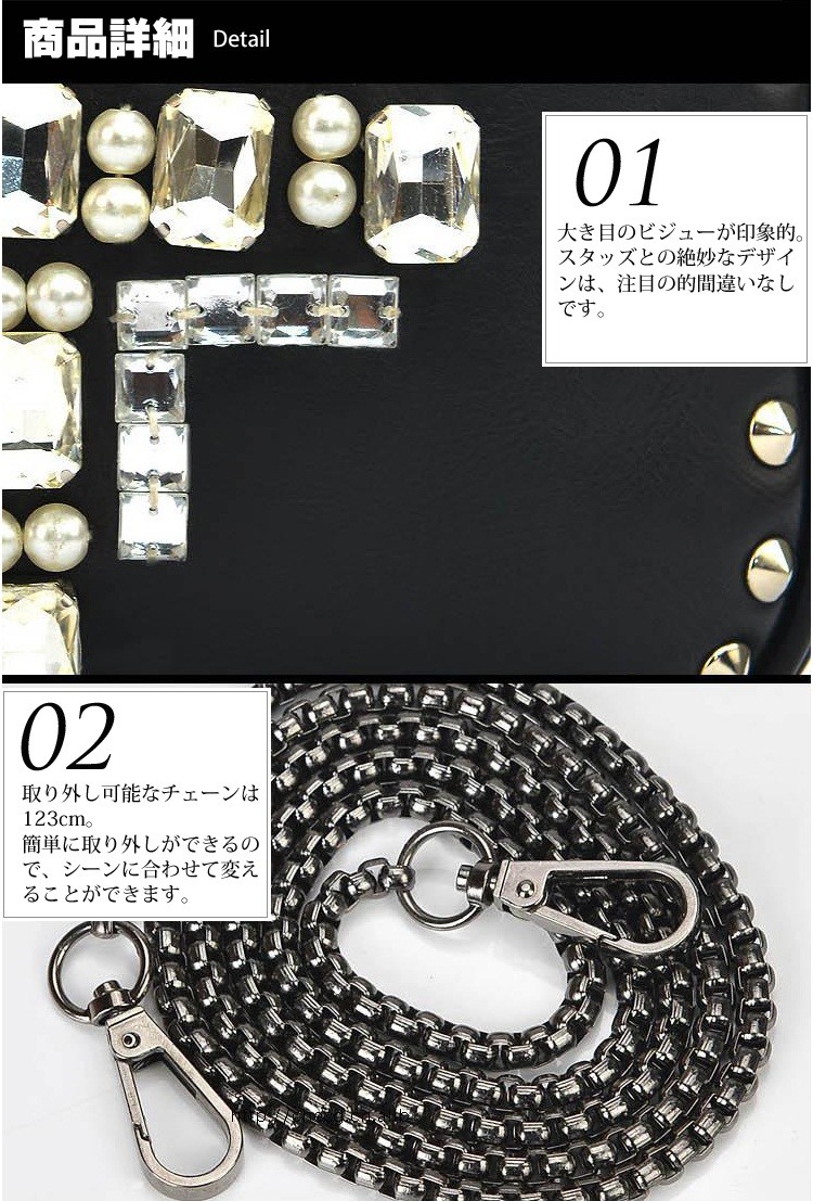 | スタッフより | 印象的なビジューデザインと細めのチェーンが女性らしくて魅力的です。チェーンは取り外してもOK☆チェーンを取り外せばかわいいクラッチバッグに。気分やコーデに合わせて簡単に変えられます☆小さいのにこんなに入る!納得の収納力。大き目のビジューが印象的。スタッズとの絶妙なデザインは、注目の的間違いなしです。取り外し可能なチェーンは123cm。簡単に取り外しができるので、シーンに合わせて変えることができます。チェーンの取り外しは、Dカンに付けるだけの簡単ワンステップ。底面には、底鋲がついているので、汚れや傷の心配もいりません。 |