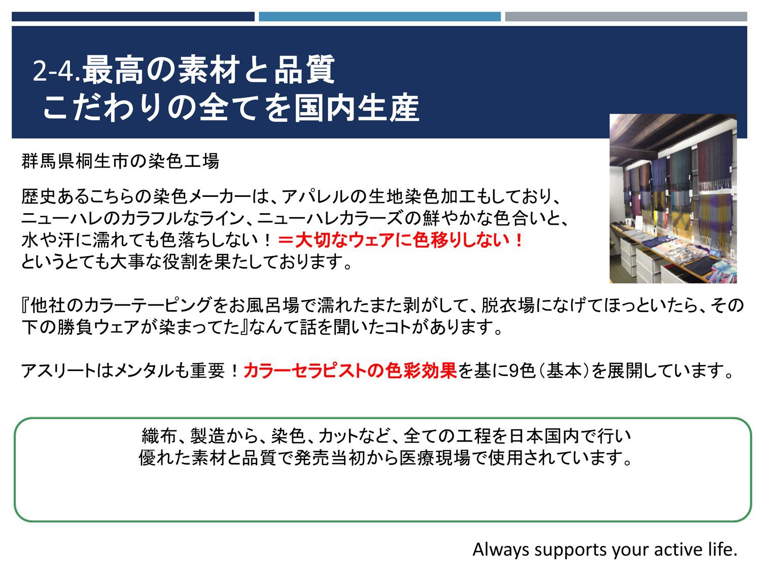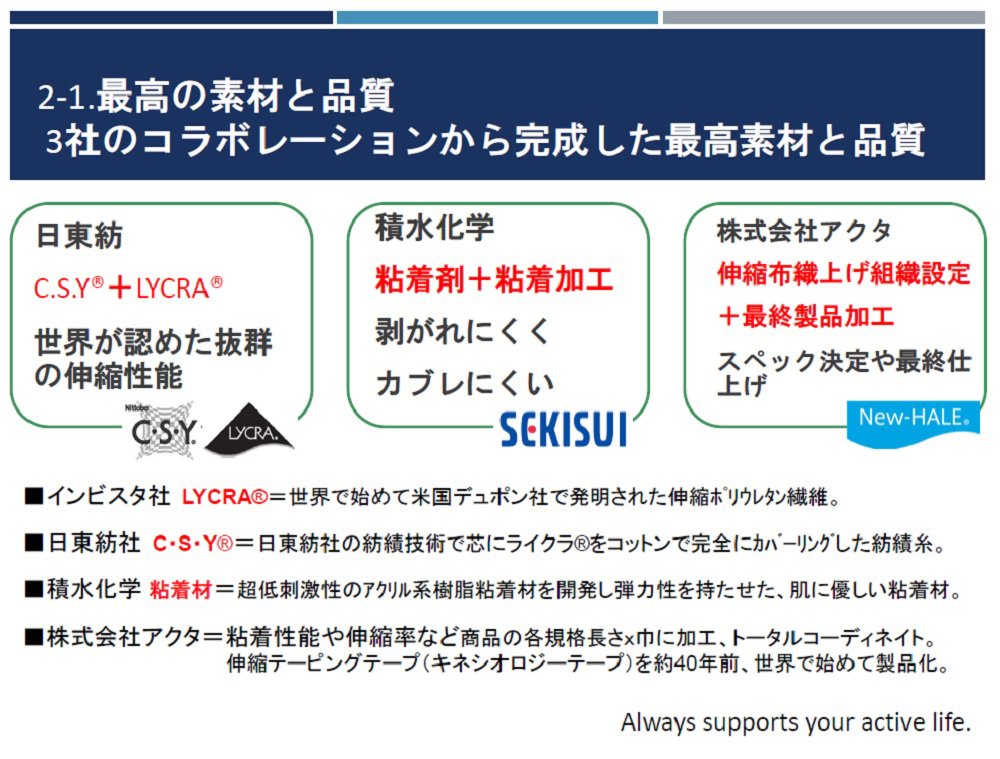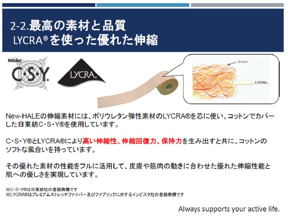 With elongation and contraction ratio of about 60% exceeding about 50% elongation rate of skin of joints such as elbows and knees, and excellent recovery recovery of LYCRA, it has adaptability to various taping as kinesiology tape · muscle tape, joints ·
