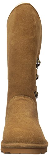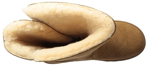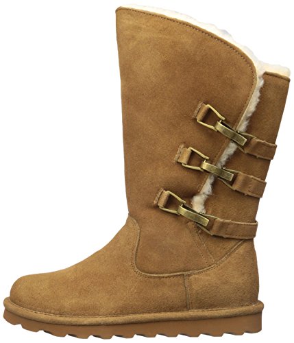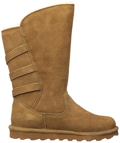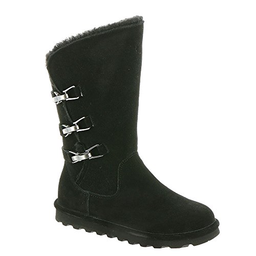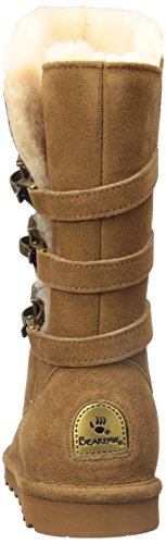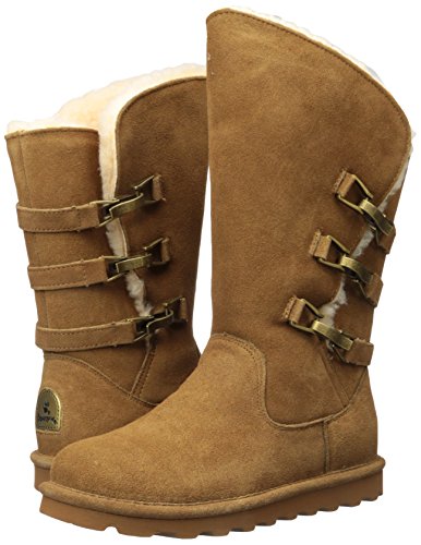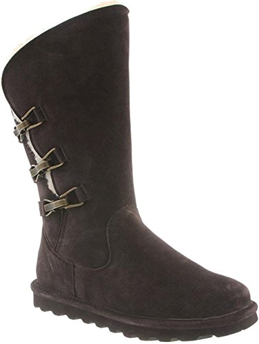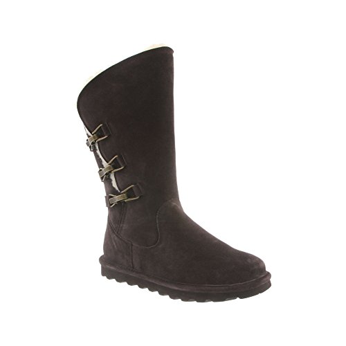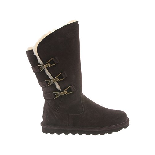 Studio : Bearpaw Publisher : Bearpaw Binding : Apparel Product Description 10" tall, treated with our "never wet" technology, cow suede upper with angled front topline, back three strap detail with oval clasp hardware. fully open on side fits many calf shapes, wool blend lining with sheepskin comfort footed on "slim tread" blown rubber outsole. 0