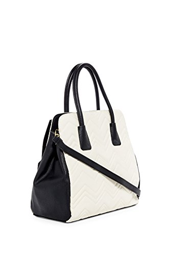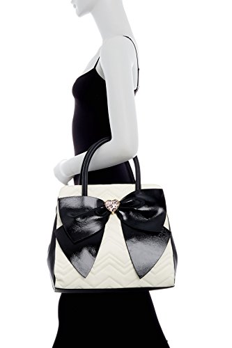 An oversized black bow with quilted cream chevron stripe detail creates charm while a multi compartment interior allows you to indulge in organization with this roomy satchel.