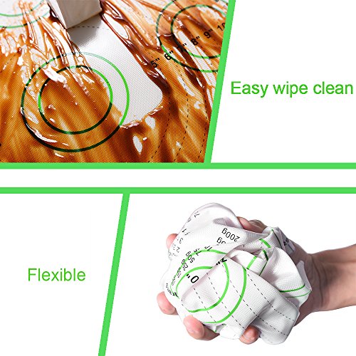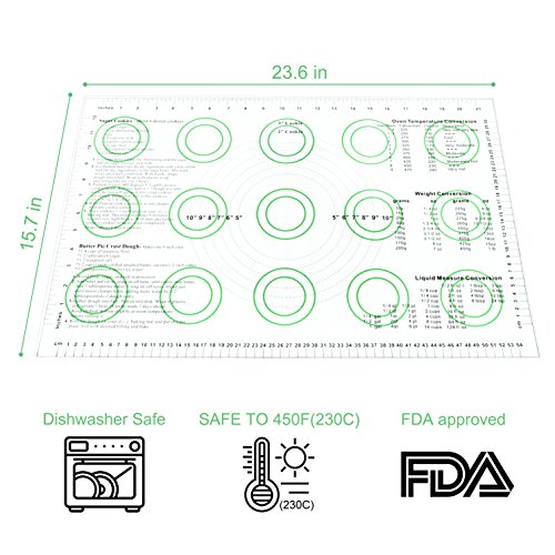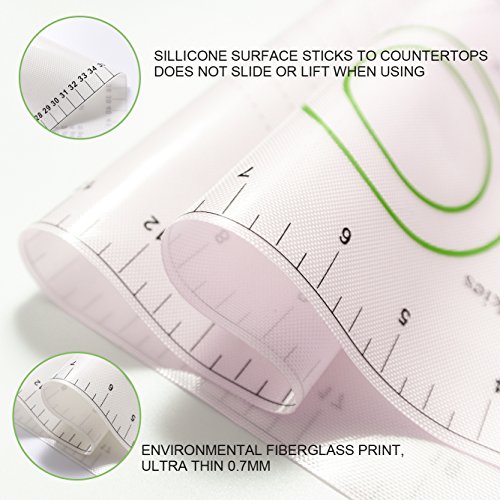 DURABLE & RESISTANT: The silicone pastry mat is temperature resistant from -40°F (-40°C) to 450°F (230°C), so you can take the mat out of the freezer and straight to the microwave or oven. The mat has a reinforced fiber cloth covered by PREMIUM FOOD GRADE SILICONE making it strong and thick.