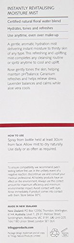 Studio : Trilogy Publisher : Trilogy Binding : Misc. Product Description A gentle, aromatic moisture-boosting mist. With an alcohol-free formula that helps complete any cleansing routine. Formulated with rose flower water, rose geranium flower oil and lavender oil. Delivers instant moisture to uplift, energize and revitalize skin. Leaves skin fresh, comfortable and vigorous looking. To use: Spray from bottle held at least 30cm from face. Allow mist to dry naturally. Use daily or as often as required 0