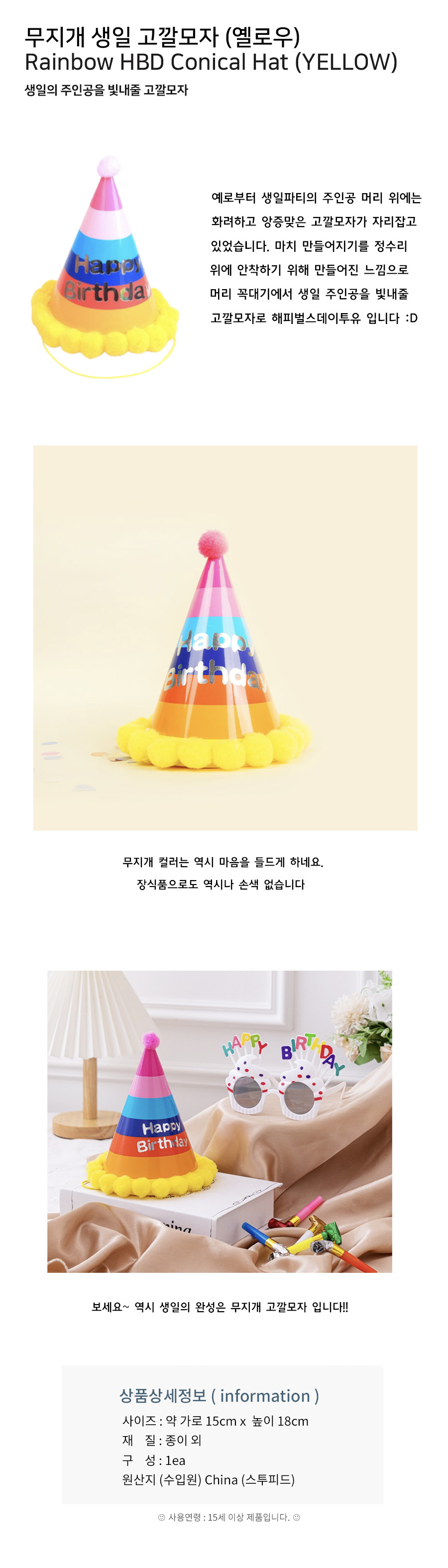 무지개 생일 고깔모자 (옐로우)