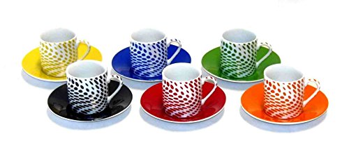 -. Brand : Alpine Cuisine -. Color : Red,Black,Orange,Blue,Green,Yellow -. Feature : Fine Porcelain Espresso Cup / Each cup stands appox. 2-1/4" tall and holds approx. 3 oz of liquid / Gift box contains 6 cups, each with its matching saucer. / Our Customer Support is available Mon-Fri 9am-4pm PST / This set of cups & saucers is the perfect size for serving an Espresso or a Turkish Coffee. -. ProductGroup : Kitchen -. ProductTypeName : KITCHEN -. Title : 12 Piece Set Alpine Cuisine AI18568 Fine Porcelain 6 Espresso Cup & 6 Saucer Set
