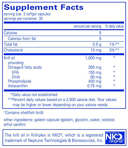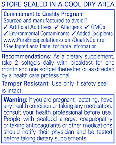 DOSAGE: Pure Encapsulations recommends 2 softgels daily with breakfast for one month and one softgel thereafter or as directed by a health professional. This product contains shellfish (krill).
