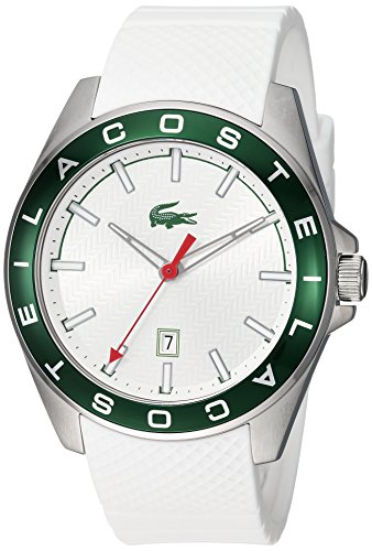 Dial features silver-tone hands and hour markers, red and green accents, date display window, minute track, and Lacoste detailing.