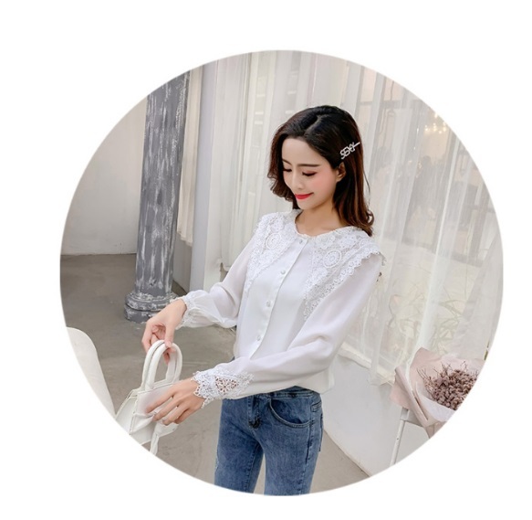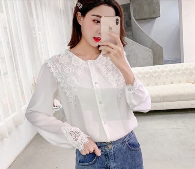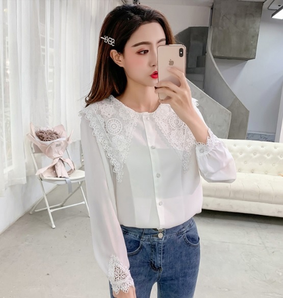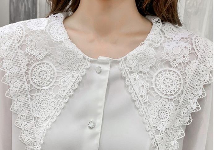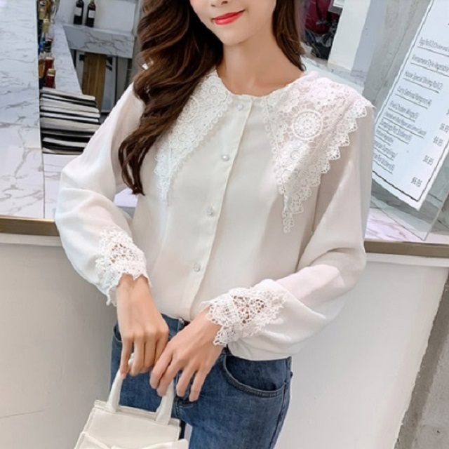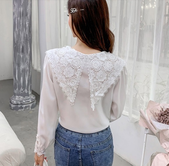 大きめの襟と袖口はレース仕様で、上品な着こなしに仕上げてくれます。