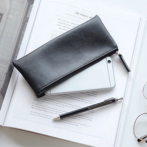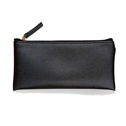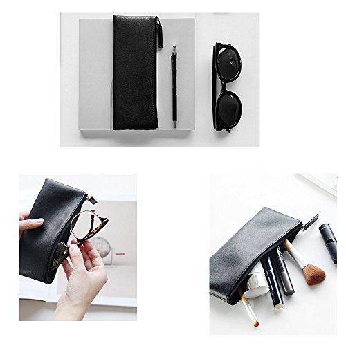 Leather Zippered Pencil Pouch Case Holder Cosmetics Bags (Black)