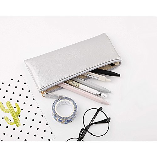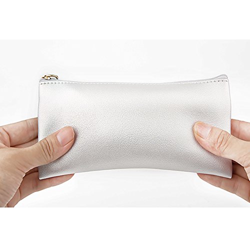 Leather Zippered Pencil Pouch Case Holder Cosmetics Bags-Silver (Silver)