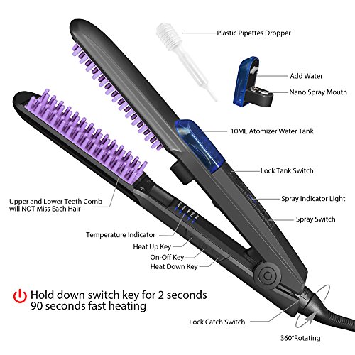 DESIGN : Hair Straightener Host + Nano Atomizer Water Tank + Plastic Pipettes Dropper.Upper and Lower Teeth comb on the hair, will not miss each hair, as long as the gentle pull, so that each hair are fully exposed to hair straight comb, it is easy to pull the show hair. Perfect combination to create hairstyles of unrivaled beauty effortlessly in a few minutes.