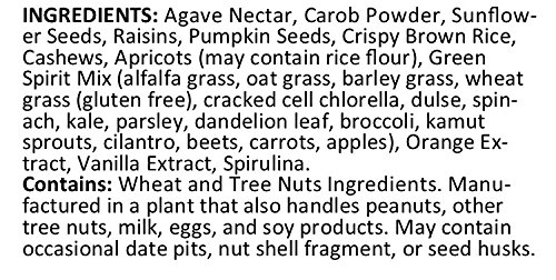 - Made from wholesome and tasty ingredients that include carob powder, sunflower seeds, raisins, pumpkin seeds, brown rice, cashews, apricots, spirulina and a mega green mix of all kinds of healthy greens from alfalfa grass to broccoli, these energy chunks are Natural, vegan and soy free!