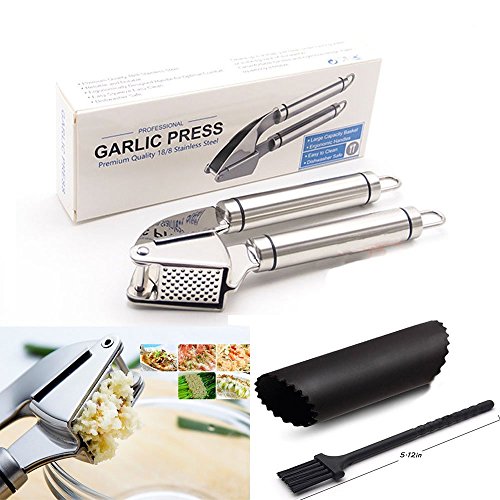Huajun Garlic Press Peeler Cleaning Brush Set, Heavy Duty Stainless Steel Mincer Chopper Grinder and Silicone Tube Roller