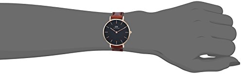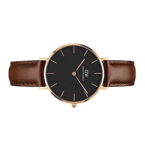 Rose gold-tone stainless steel case with a brown leather strap. Fixed rose gold-tone bezel. Black dial with rose gold-tone hands and index hour markers. Dial Type: Analog. Quartz movement. Scratch resistant mineral crystal. Pull / push crown. Solid case back. Case size: 32 mm. Case thickness: 6 mm. Round case shape. Band width: 14 mm. Tang clasp. Water resistant at 30 meters / 100 feet. Functions: hour, minute. Casual watch style. Daniel Wellington Classic Petite St Mawes Ladies Watch DW00100169.Feature