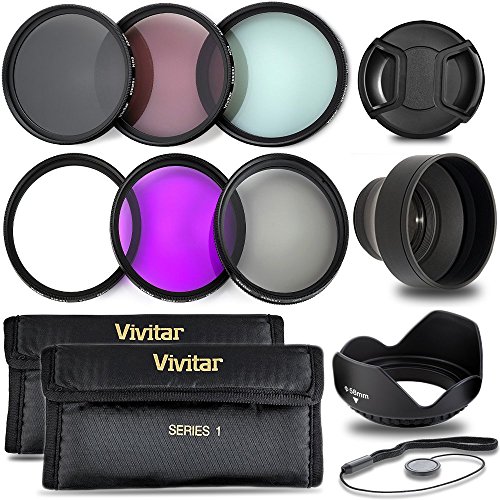 THE AMAZING KIT INCLUDES - 2X lens filter pouch carry case, tulip lens hood, snap on lens cap, lens cap keeper, Soft rubber lens hood, microfiber cleaning cloth, free mini flexible tripod.
