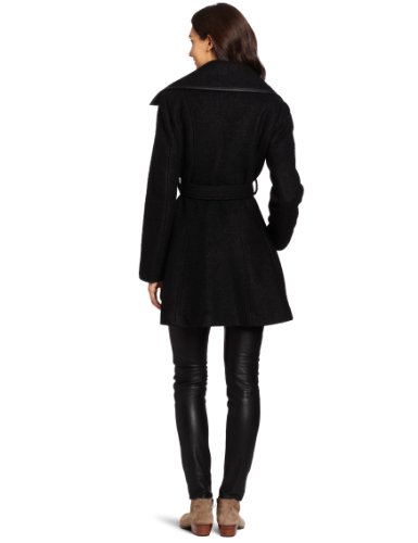 Boucle assymetrical belted coat with pu trim and gold heart zipper pull
