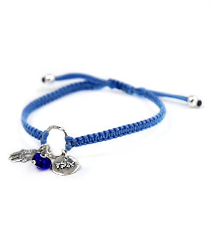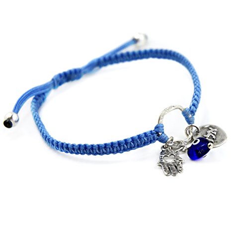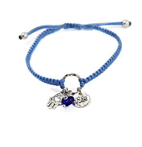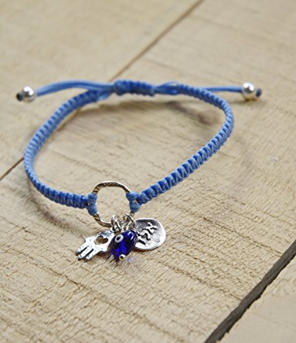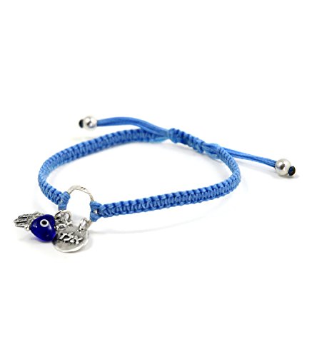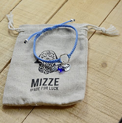 -. Feature : 72 NAMES OF GOD AND EVIL EYE BRACELET WITH SILVER HAMSA HAND FOR PROTECTION - The light blue charm bracelet features the Hamsa Hand - an open right hand, that is used as a sign of protection in many cultures throughout history, the Hamsa is believed to provide defense against the evil eye. The bracelet also includes a blue glass Evil Eye and a A.L.D charm for protection. / 72 NAMES OF GOD - The Hebrew letter sequence "Alef", "Lamed" and "Daled" (A.L.D) is one of the 72 names of God, believed to protect against the Evil Eye and ill will of others. / 925 STERLING SILVER CHARM BRACELET - The charms include the Kabbalah A.L.D coin, a Hamsa Hand and glass Evil Eye charm - all in 925 sterling silver. / ADJUSTABLE CHARM BRACELET DIMENSIONS - The hand woven macrame wax cotton cord charm bracelet is adjustable for women, and fits most wrists, size 6.5" - 7.5". / **100% FULL MONEY BACK GUARANTEE: MIZZE Made for Luck Jewelry provides a 100% full money back guarantee. If you are unhappy with your Charm Bracelet, for any reason, please contact us!