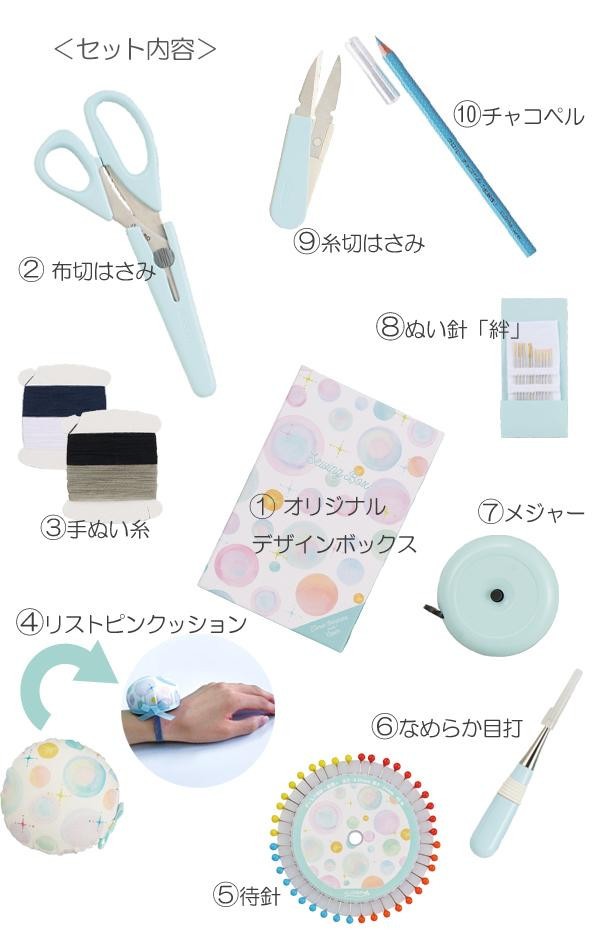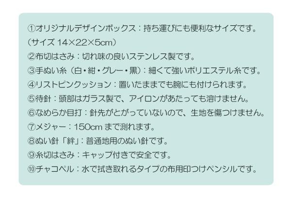 | セット内容 | (1)オリジナルデザインボックス (2)布切はさみ (「キャポ」210) (3)手ぬい糸 白・紺・グレー・黒 (4)リストピンクッション (5)待針 (6)目打 (なめらか目打) (7)メジャー (まんまるメジャー) (8)縫い針「絆」 (9)糸切はさみ (「キャポ」100) (10)チャコペル ※()内はクロバー株式会社発売・同名商品の当セットオリジナルカラー製品です。 |