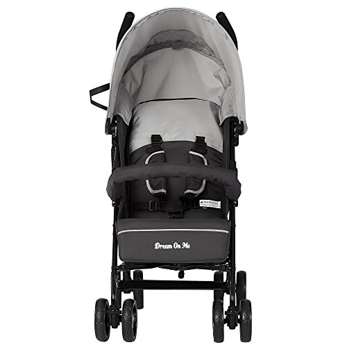 Dream On Me Jasper is a convenient lightweight stroller. Its swivel front wheels provides a smoother ride over curbs and uneven surfaces. The backrest can be adjusted to a sleeping position and the extendable full cover creates a shield environment for your child. The Jasper adjustment of the backrest positon is done with a one hand grip places at the center of the backrest enabling a smooth transition between different positions. The angle and slop between the padded handle and rear wheels make space for easy walking. Dream On Me Jasper offers a quick and simple compact fold design for travelling and storage also features an extended footrest, 5-point harness, accessible basket an easy braking system. This model has a new and improved lightweight frame which makes a total weight of 14. Lbs. All textiles are treated to help protect against dirt and makes the Jasper easy to keep clean.Feature