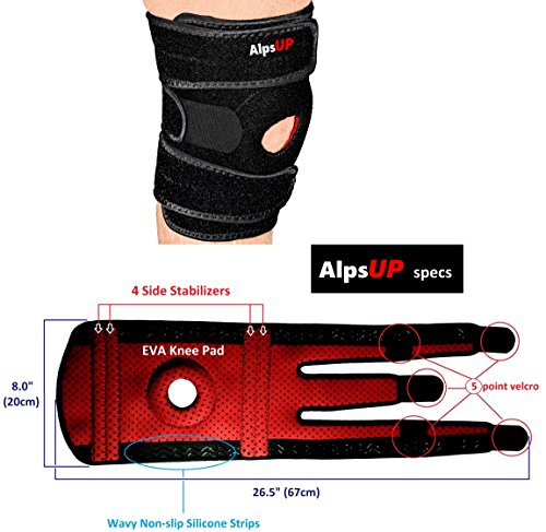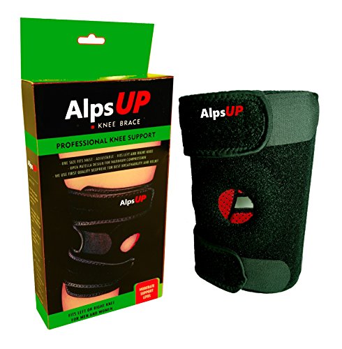 - AlpsUP OPEN PATELLA DESIGN helps to reduce pressure and stress on the knee. Good for sports and everyday use. Relieves chronic knee pain. Alleviates acute suffering due to arthritis, fatigue, strains and sprains. Reduces knee swelling. Suggested for recovery in injuries or surgeries in its final phase. One size fits knees 12"-23" in circumference