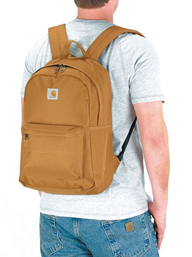 The Carhartt Trade Series Backpack is tough, versatile, roomy, and simple. Built of sturdy synthetic fabric with Rain Defender durable water repellent, the Trade Series backpack is large enough for high school students’ books and supplies, and will keep whatever you’re hauling safe and dry. The large main compartment with zippered opening has enough space for a whole day's worth of gear. The front zippered pocket keeps smaller items from getting lost and has two additional mesh pockets and a key fob inside. The Carhartt Trade Series Backpack includes YKK zippers, metal hardware, triple needle-stitch construction, and the Carhartt logo patch. Like all Carhartt Work Bags, Packs, and Gear, the Carhartt Trade Series Backpack is covered by a limited warranty against defects in materials and workmanship. Dimensions: 12w x 17.5h x 6d inches; 0.7 pounds.Feature