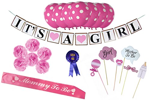 -. Feature : Includes "Mommy-To-Be" Sash, "Dad-To-Be" Button, "It's a Girl" Banner, 6 Photo Booth Props, 20 Pink Polkadot Balloons, and 6 Pink Pom Poms to hang / Save time and money- this kit has everything you will need to put on a baby shower! / "Dad-To-Be" button even gets the man involved!