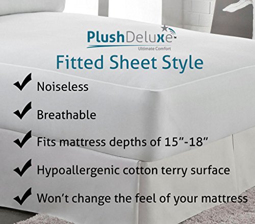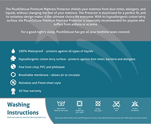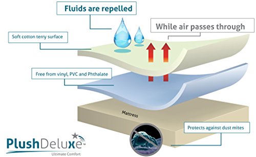 -. Feature : 100% WATERPROOF PROTECTION: Repels All Types Of Liquids Including Fluids, Perspiration, Bedwetting And Stains. / HYPOALLERGENIC: Protects Against Dust Mites, Allergens, Bacteria, Great For Those Suffering From Asthma Or Eczema, Its Breathable Membrane Allows Air To Circulate Yet Repels Liquids. / COMFORT SURFACE: Soft Cotton Terry Surface Won't Change The Feel Of Your Mattress, It Is Noiseless, Free From Vinyl, PVC, And Phthalate, Its Fitted Sheet Style Will Fit All Mattress Depths From 15" to 18". / WASHABLE: Durable And Easy To Clean- Machine Wash And Low Tumble Dry. / 100% SATISFACTION GUARANTEE: PlushDeluxe Premium Mattress Protector Is Backed By A 10-Year Full Product Replacement Warranty. Purchase With Confidence Knowing You Can Simply Return It For A Full Refund.