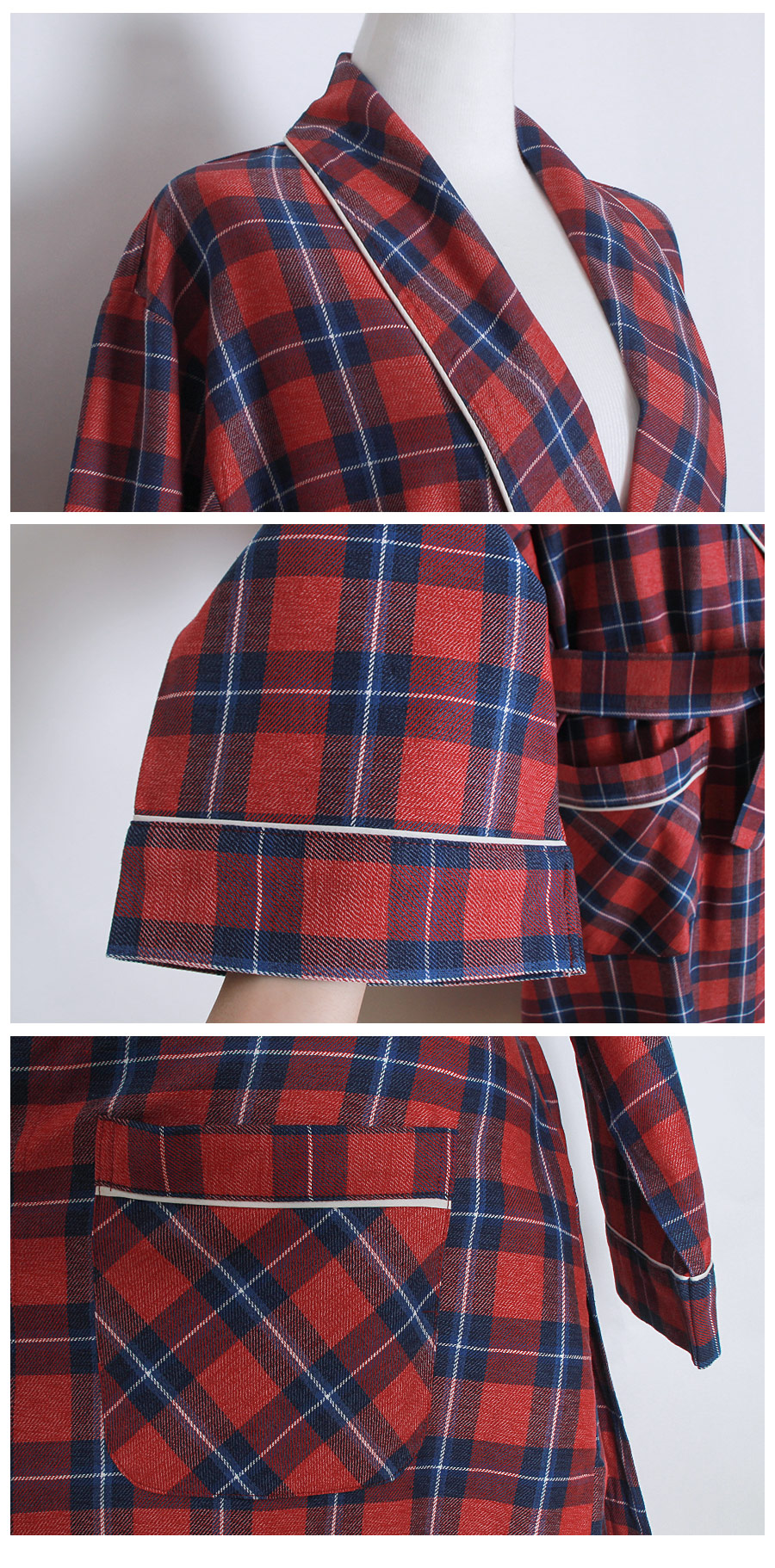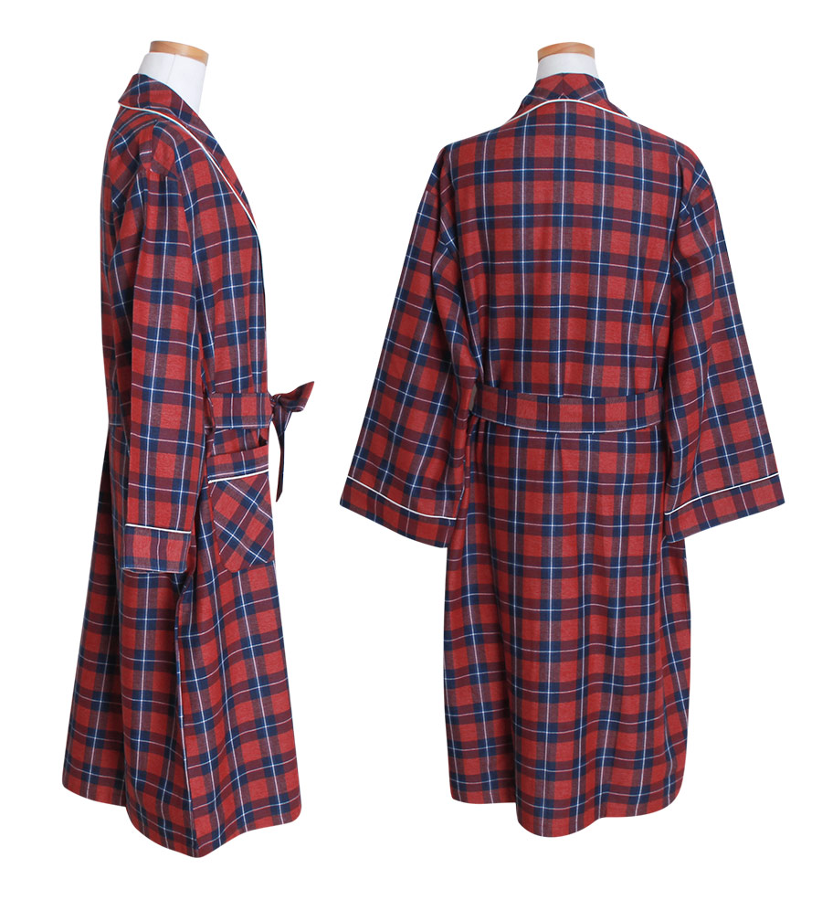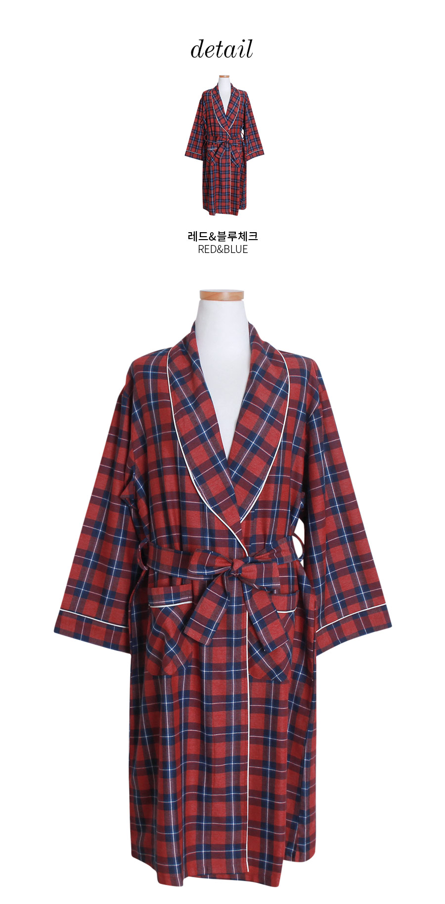 프린팅이 아닌 직접 염색해서 짠 체크 조직의 원단으로 더 탄탄하고 고급스럽습니다. 흐트러짐 없는 조직감으로 오래 꺼내 입을 수 있는 fw 파자마세트랍니다. 따뜻하고 포근한 느낌의 레드 컬러를 메인컬러로 제작한 원단으로 스타일리쉬하게 연출하기 좋습니다. DETAIL 모던한 스타일로 질리지 않고 계속 해서 손이 갈 로브랍니다. 카라의 끝 부분부터 클로징 부분까지 크림아이보리 컬러의 파이핑을 봉제 해 깔끔하게 포인트를 주었습니다. 양 사이드 포켓은 바이어스처리 해 봉제했습니다. 낙낙한 사이즈로 실용성을 높여주었습니다. 소매에도 파이핑을 둘러주어 마무리했습니다. 깔끔하고 감각적인 체크패턴의 디자인이라 선물용으로도 좋습니다. 100% 국내 제작으로 소재, 디자인, 봉제의 퀄리티가 높습니다. SIZE 44반~66반size까지 커버 가능한 free사이즈입니다.