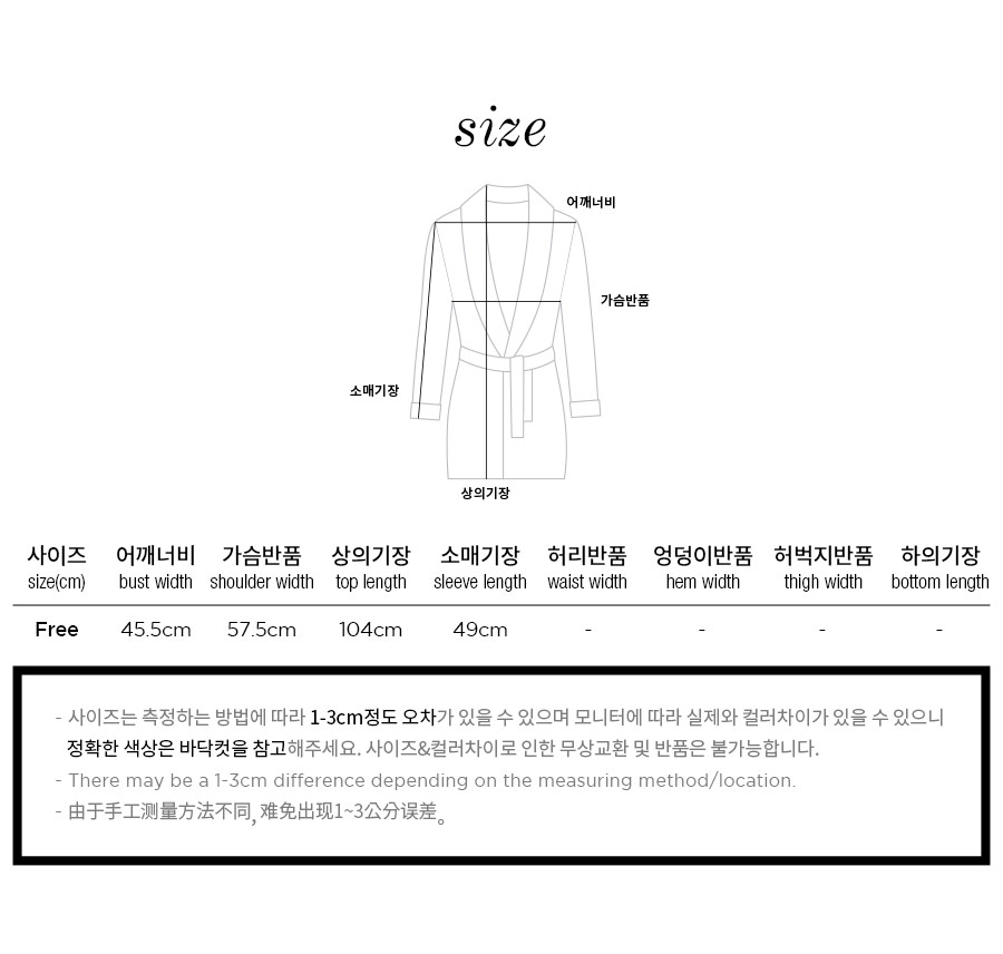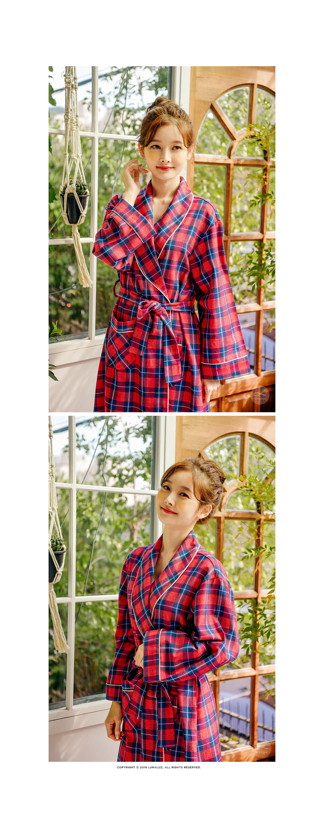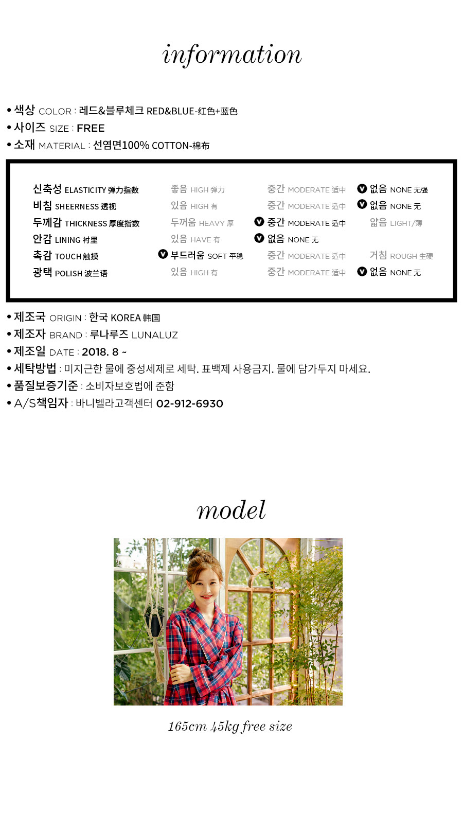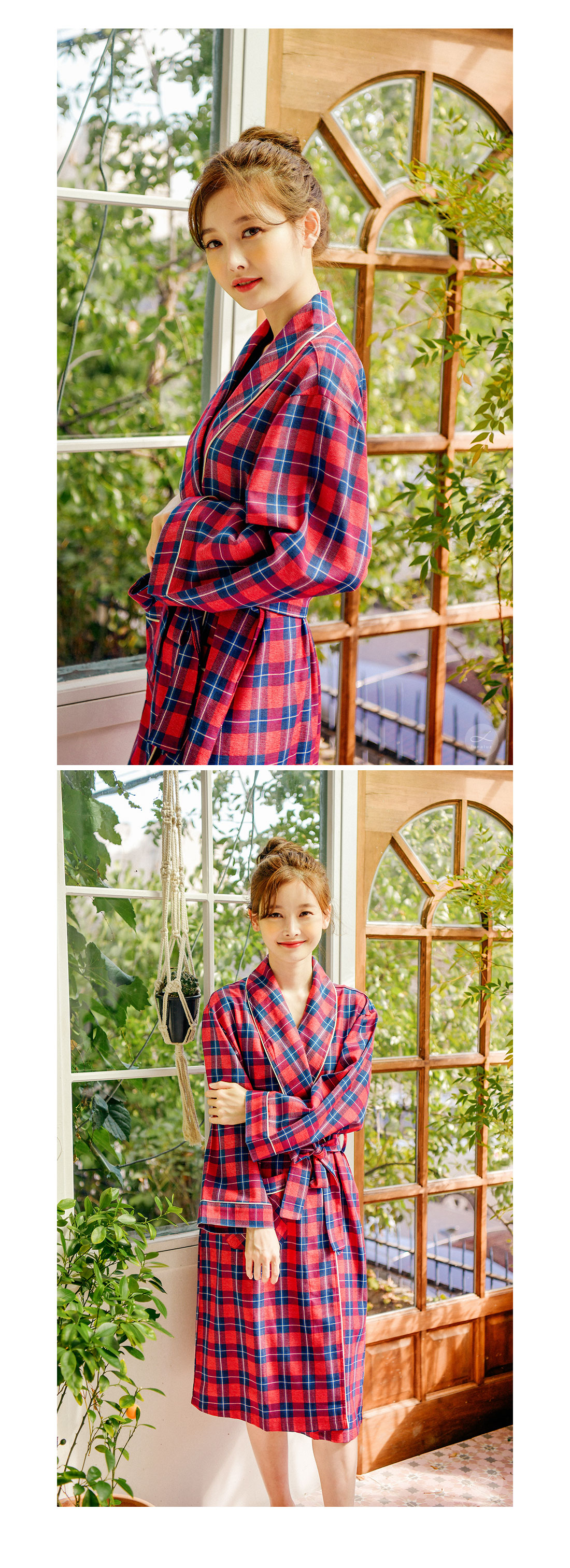 프린팅이 아닌 직접 염색해서 짠 체크 조직의 원단으로 더 탄탄하고 고급스럽습니다. 흐트러짐 없는 조직감으로 오래 꺼내 입을 수 있는 fw 파자마세트랍니다. 따뜻하고 포근한 느낌의 레드 컬러를 메인컬러로 제작한 원단으로 스타일리쉬하게 연출하기 좋습니다. DETAIL 모던한 스타일로 질리지 않고 계속 해서 손이 갈 로브랍니다. 카라의 끝 부분부터 클로징 부분까지 크림아이보리 컬러의 파이핑을 봉제 해 깔끔하게 포인트를 주었습니다. 양 사이드 포켓은 바이어스처리 해 봉제했습니다. 낙낙한 사이즈로 실용성을 높여주었습니다. 소매에도 파이핑을 둘러주어 마무리했습니다. 깔끔하고 감각적인 체크패턴의 디자인이라 선물용으로도 좋습니다. 100% 국내 제작으로 소재, 디자인, 봉제의 퀄리티가 높습니다. SIZE 44반~66반size까지 커버 가능한 free사이즈입니다.