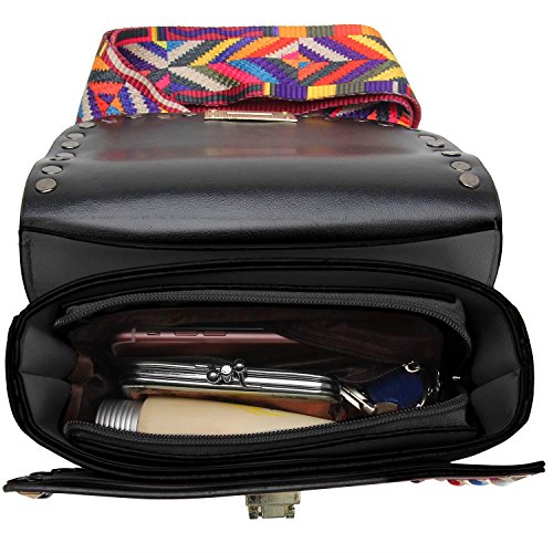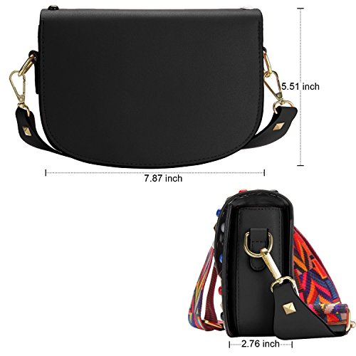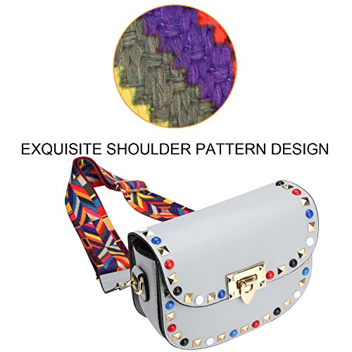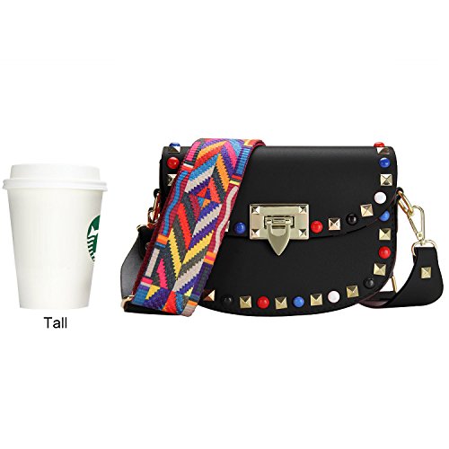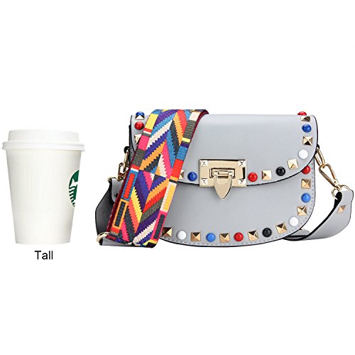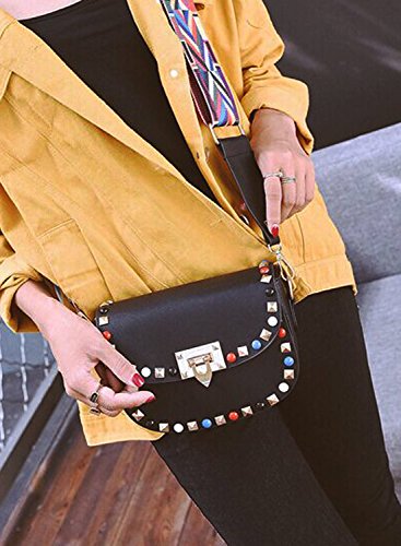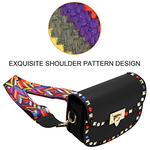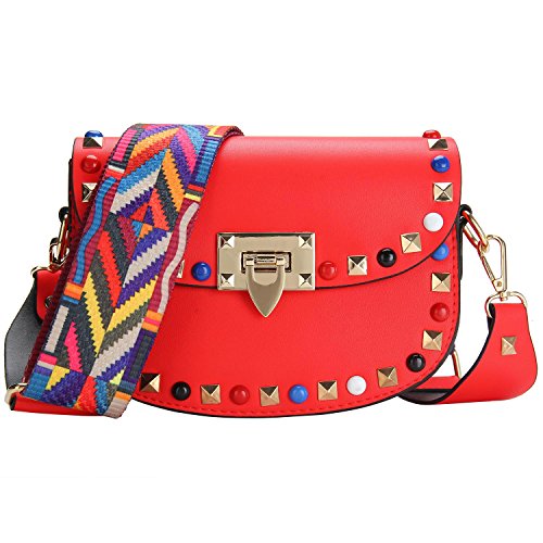 -. Feature : Made of durable PU leather with good sense of touch, compact structure with the dimension of 7.87(L)* 2.36(W)*5.51(H) / Beautiful external candy color decoration with rivets, which is the fashionable style for the year of 2017, and various types can be at your choice / The shoulder bag strap with colorful and elegant stripes design can be adjusted at anytime and anywhere, it will also give you an impression of uniqueness. / Our handbag contains one large main pocket and another small side pocket inside, all can be easily opened with easy tip movement over the zippers. you can have your make up, phones, wallets and keys and so on in there. / Our guarantee: refund is available if you are not not satisfied with our cross body bag at 100%.