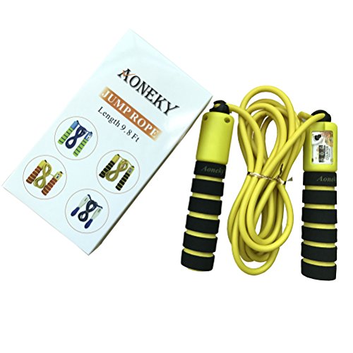 Studio : Aoneky Publisher : Aoneky Binding : Misc. Product Description Do you have these problems when you jump rope? 1. Your children want to jump rope when you are using it, but your jump rope is not suitable for them. 2. You always forget how many jumps have you jumped while you are jumping. Now the Aoneky Jump Rope has solved your problems! You can skip it, and your kids can skip it too with the adjustable Aoneky Jump Rope. Take turns jumping with your children by instantly adjusting the rope. When they are tired, lengthen the rope and take a turn, switching it back when you are done. The Aoneky Jump Rope is designed with a counter, so you don't need to count jumps any longer. Features 1. It has an adjustable length; no need to cut the rope like other jump ropes. 2. It has a built-in counter in its right handle. 3. Its hollow plastic handles have foam grips with ridges, making it more comfortable. 4. The rope length is 9.8 feet, and it's suitable for individuals as tall as 6.0 feet. 5. Arriving in a custom-designed Aoneky colorful box, it's a great gift for both children and women. Specifications Brand: Aoneky Handles: Hollow Plastic Handles Grips: Foam Grips Rope: Foam, 9.8 Feet Recommended for kids Age 3 Years and Above, Height less than 6.0 Feet Package List 1 x Jump Rope 1 x Colorful Box(see picture) Note: You should remember to always have the counter in the right hand and turn the rope clockwise to get the correct recordings, or else the counter will not work. 0