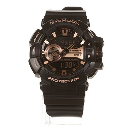 From super-tough G-SHOCK comes a new collection of GA-400 with a large rotary switch for intuitive operation. Basic G-SHOCK black is accented in gold to create a HIP-HOP artist or B-BOY fashion item motif. Black with gold, which are employed in a large number of accessories, is used on the case, band, and face, for a boldly cool design.Feature