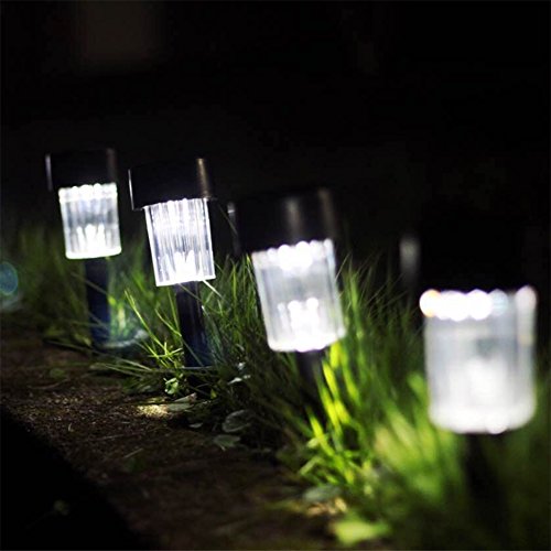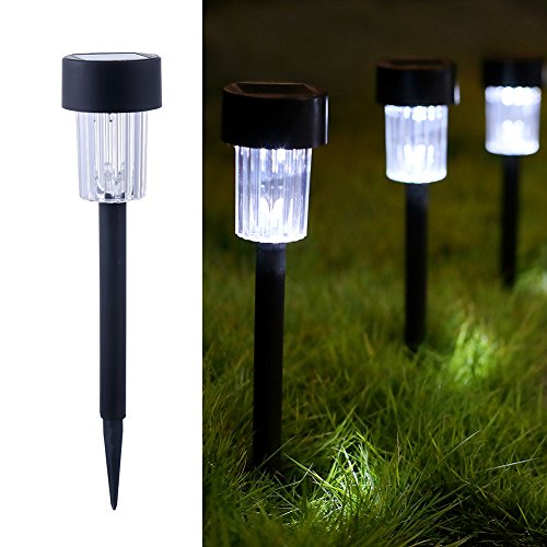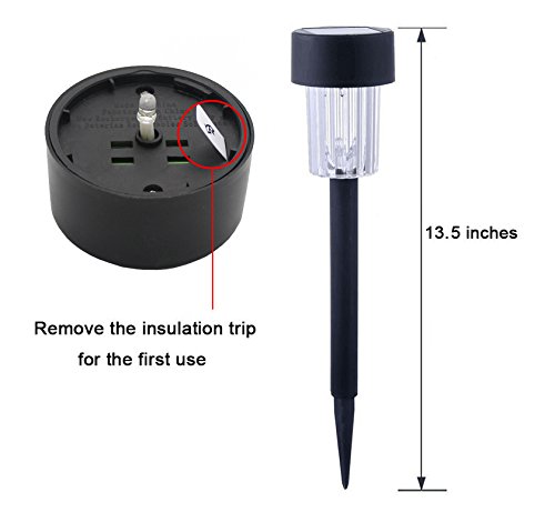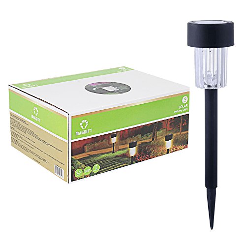 Specifications: 1.Material: Plastic 2. Light color: White 3. LED quantity: 10 LED 4. Rechargeable battery: Ni-MH aa200mah 5. Dimensions: 4.92*4.92*13.5 inches (l x w x h) features: Maggift solar pathway lights are perfect for adding magical romantic lighting to your walkway, sidewalk, garden, or patio. The solar panel converts sunlight during the day and charges the battery. At night, the lights will be turned on automatically and can last for 8 hours or more. Designed for outdoor use and for all weather conditions. No worries about raining, snowing, frosting, even sleeting. Easy to install, just push the stake into the soil and they will come on automatically at night and turn off automatically at dawn. The stakes are placed in the tubes, before install, you need take them from the tubes. Notes: 1.The solar lights need to charge in full and direct sunlight for 6-8 hours. If the sunlight is not enough or the charging time is not enough, the light may not work at night, but it is not damaged. 2. Before charging, you need to turn the lamp 30 degrees counterclockwise to separate, then take out the white insulation trip. 3. If the ground is too hard, try to soften the ground with water and then insert into the ground. If you twist or hammer it with force may result in product damage. 4. Solar lights need to keep away from the street lights, otherwise it will affect the normal use of solar lights.Feature