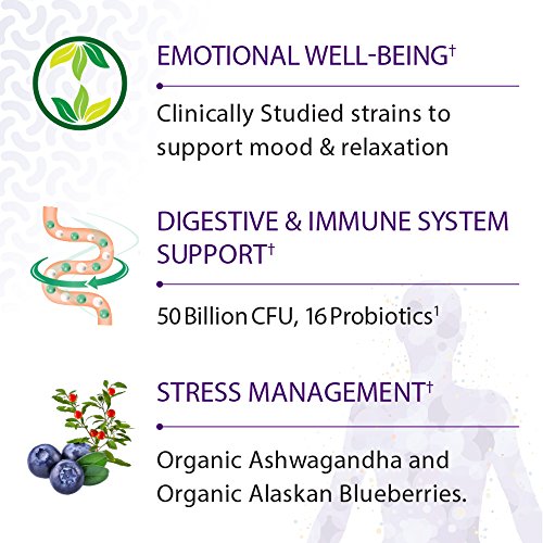 -. Feature : DIGESTION SUPPORT: This 50 billion CFU probiotic supplement contains Lactobaccilus acidophilus and Bifidobacteria for digestive health and constipation relief / MOOD SUPPLEMENT: Clinically studied probiotics L. helveticus R0052 and B. longum R0175 support mood, relaxation and emotional wellbeing plus 350 mg of organic ashwagandha and organic Alaskan blueberries for stress reduction / IMMUNE SUPPORT: This dietary supplement has 50 billion CFU and 16 probiotic strains for immune system health / SHELF STABLE PROBIOTICS: This 50 billion probiotic comes in 60 capsules / HYPOALLERGENIC PROBIOTIC: Our probiotics supplement is gluten free, vegetarian, and made with over 70% organic ingredients