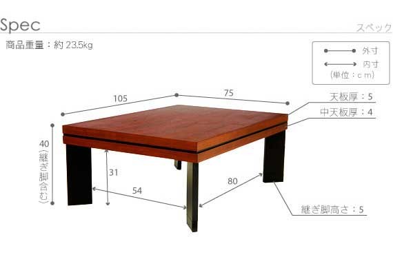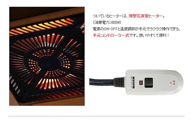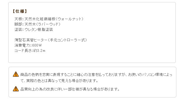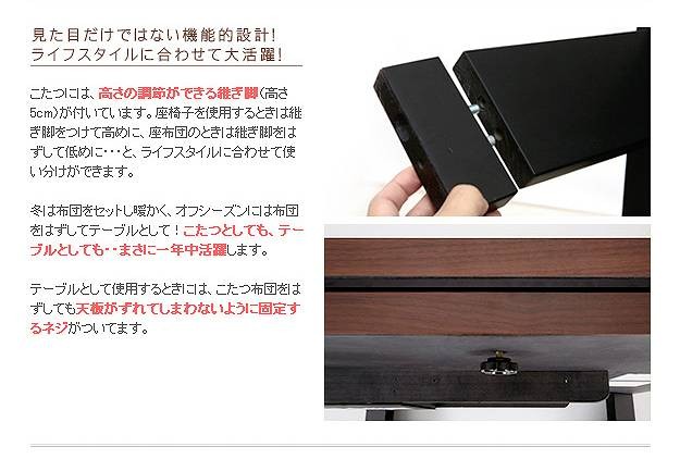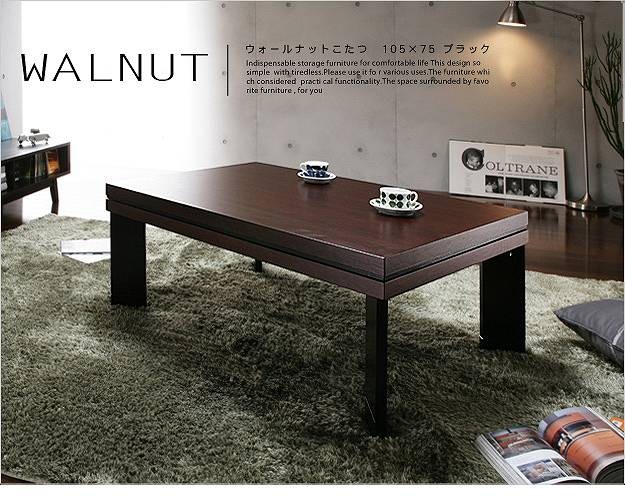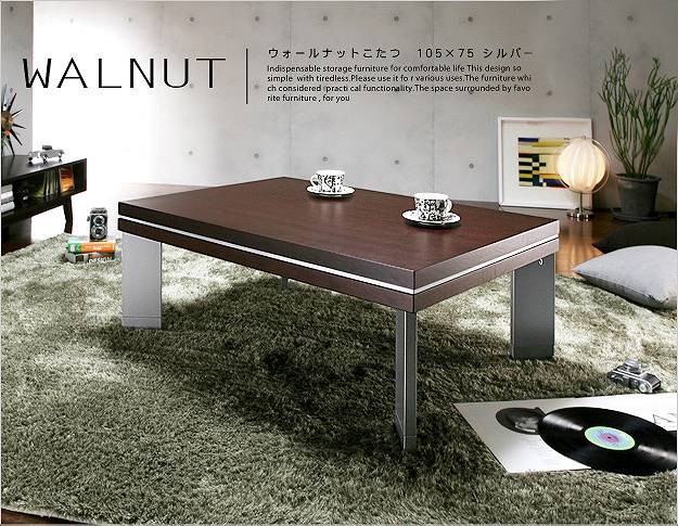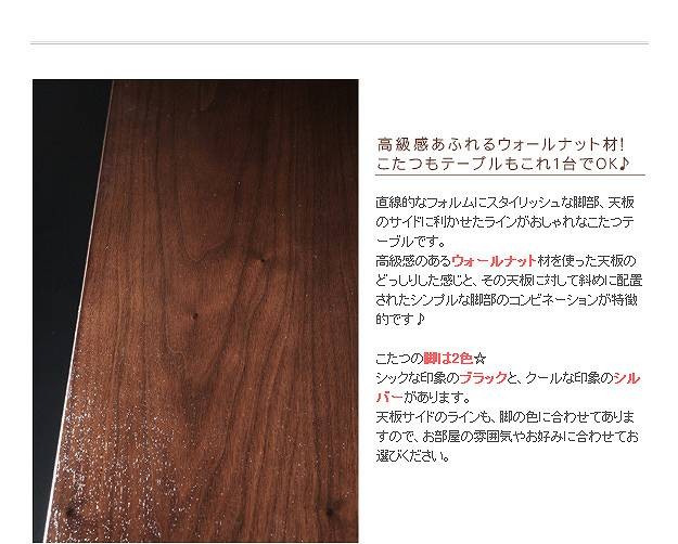商品について:高級感のあるウォールナット材と脚部のコンビネーションがおしゃれなこたつテーブル。選べる2色の脚部に天板のサイドに利かせたラインがスタイリッシュ。こたつもテーブルもこれ1台でOKです♪薄型石英管ヒーター(手元コントローラー式)。便利な継ぎ脚付(高さ5cm)。