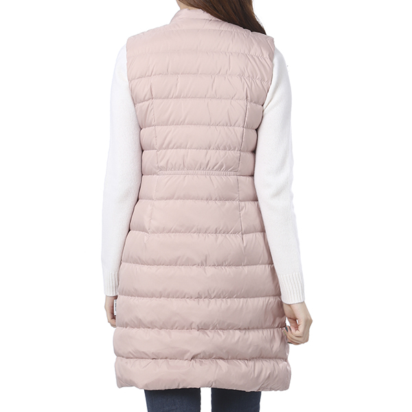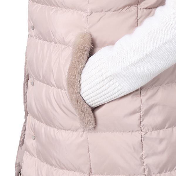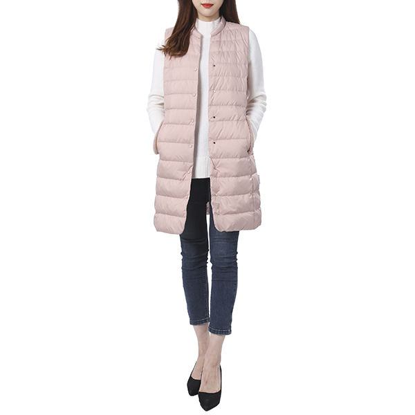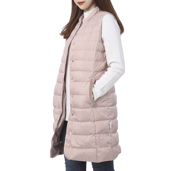 깔끔한 솔리드 컬러가 어우러진 퀄팅 디자인으로 모피를 배색하여 고급스러운 외관을 연출한 롱한 기장의 다운 베스트 점퍼입니다.