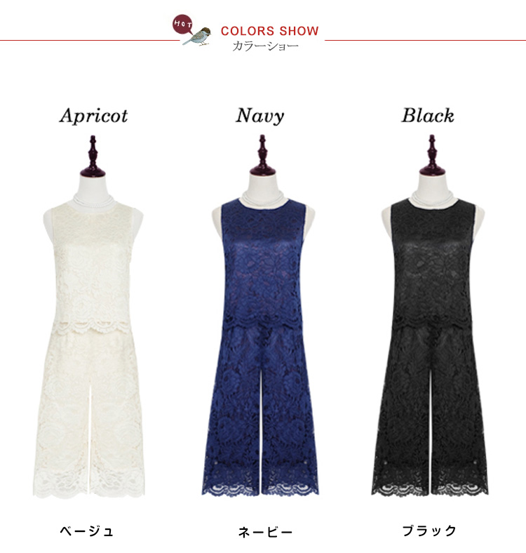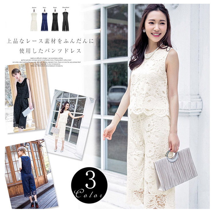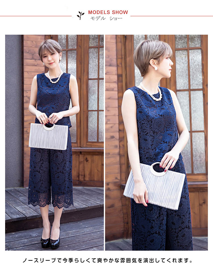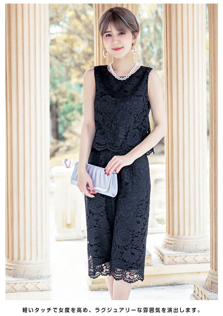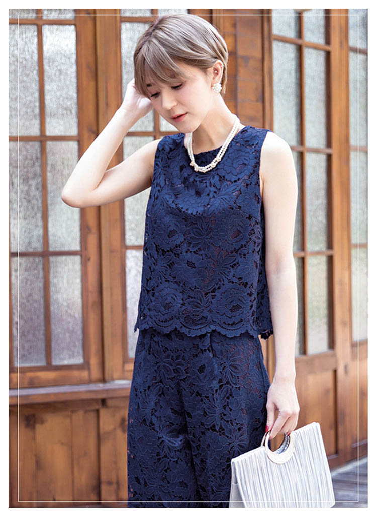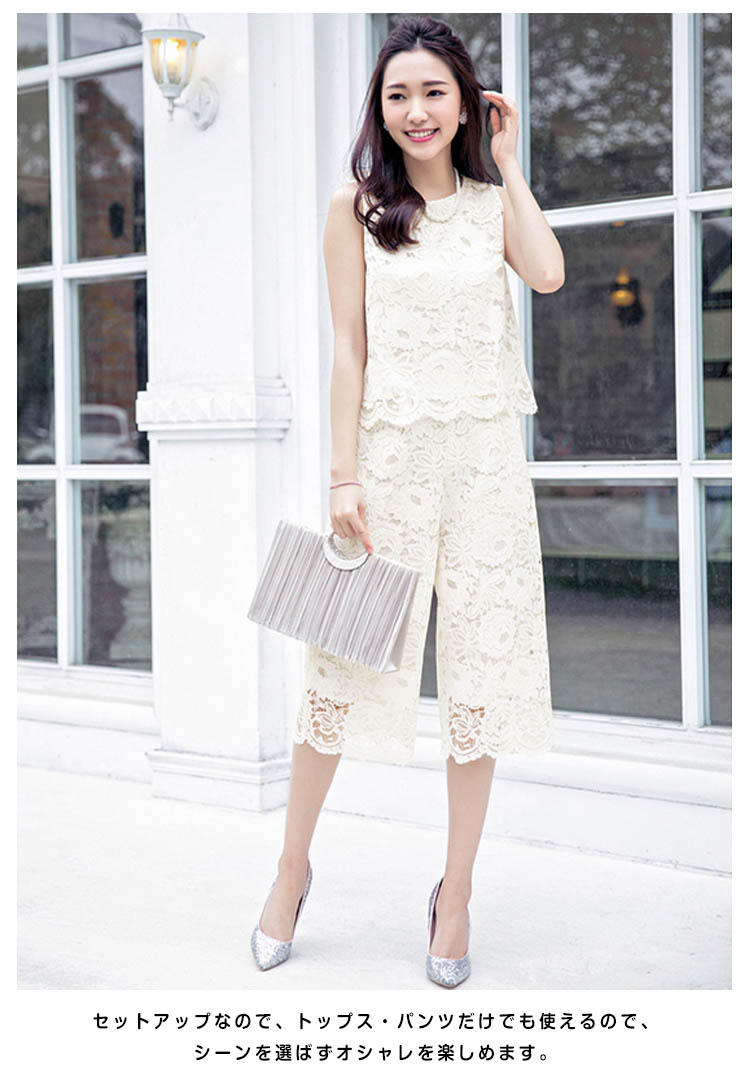 | 上品なレース素材をふんだんに使用したパンツドレス。ノースリーブで今季らしくて爽やかな雰囲気を演出してくれます。ちょっとしたお出掛けや通勤やパーティーなど、特別な日の一着として重宝しそう☆軽いタッチで女度を高め、ラグジュアリーな雰囲気を演出します。 セットアップなので、トップス・パンツだけでも使えるので、シーンを選ばずオシャレを楽しめます。 | |