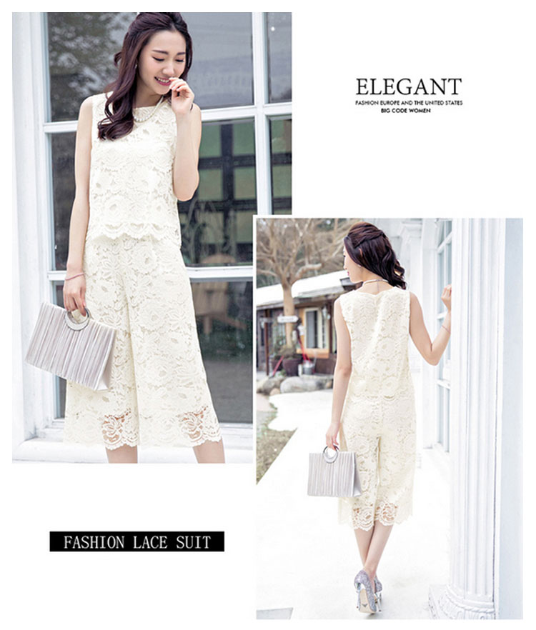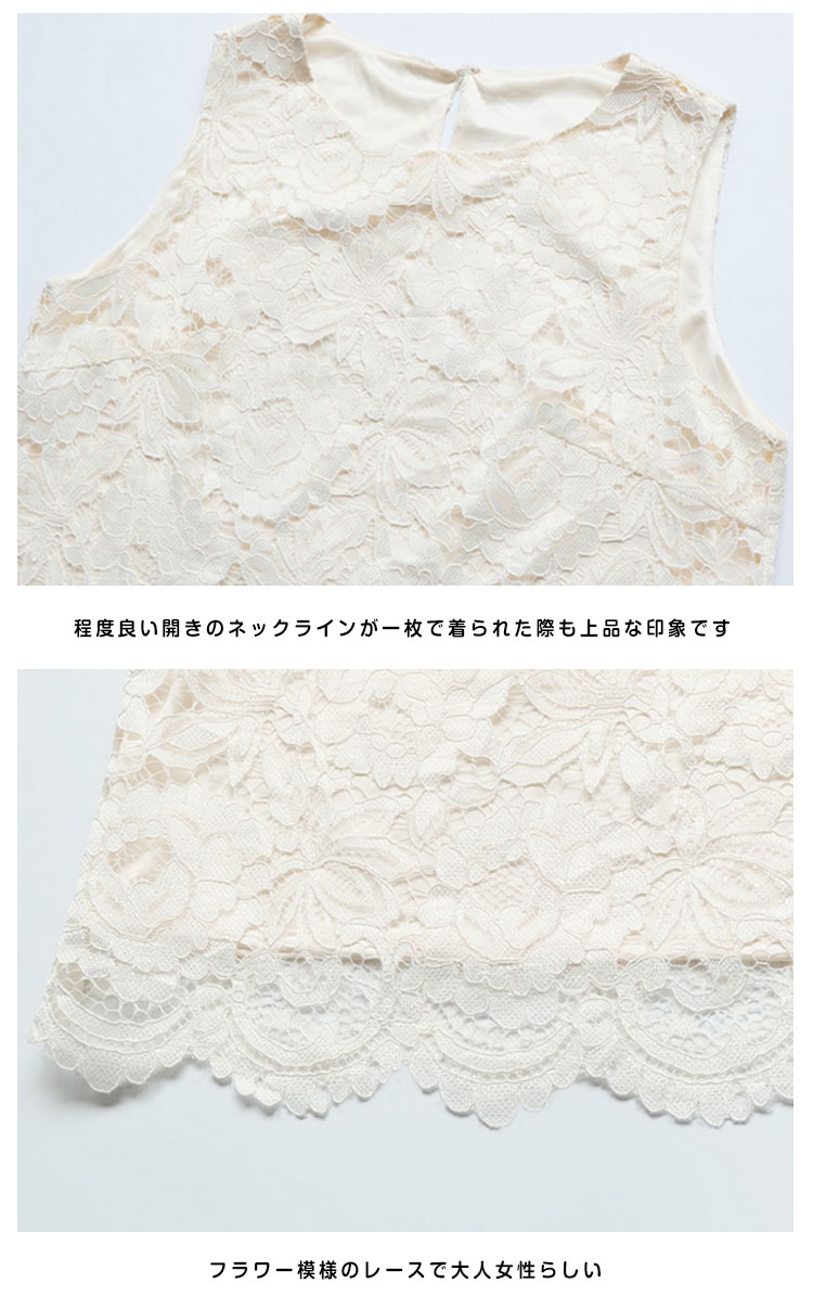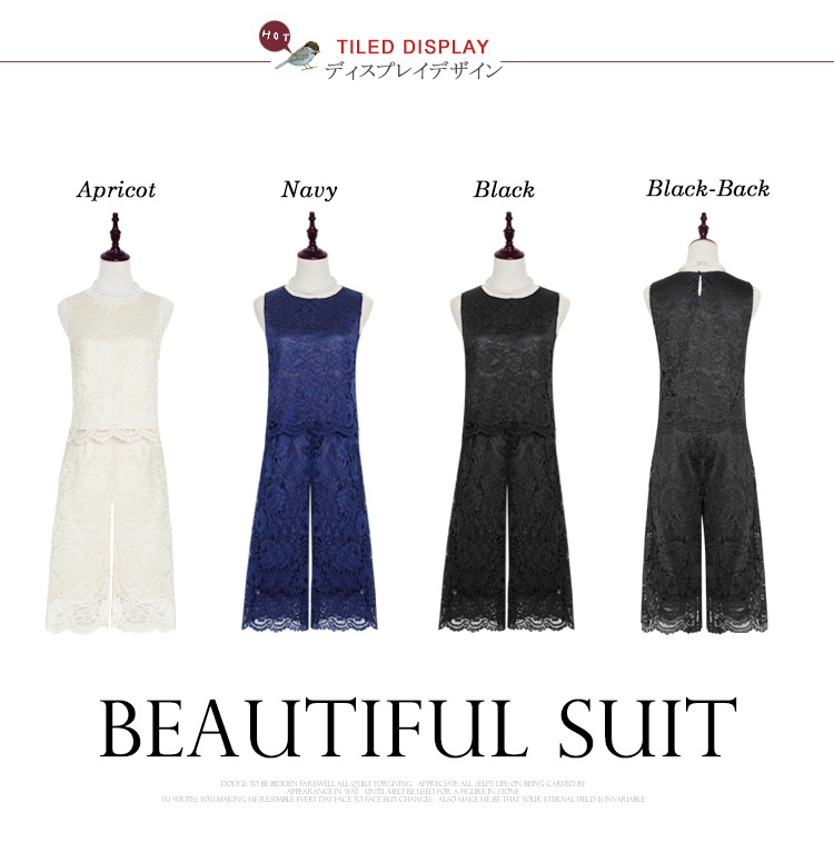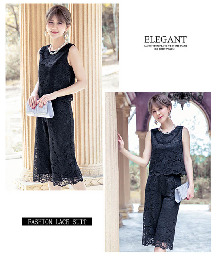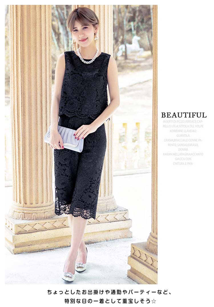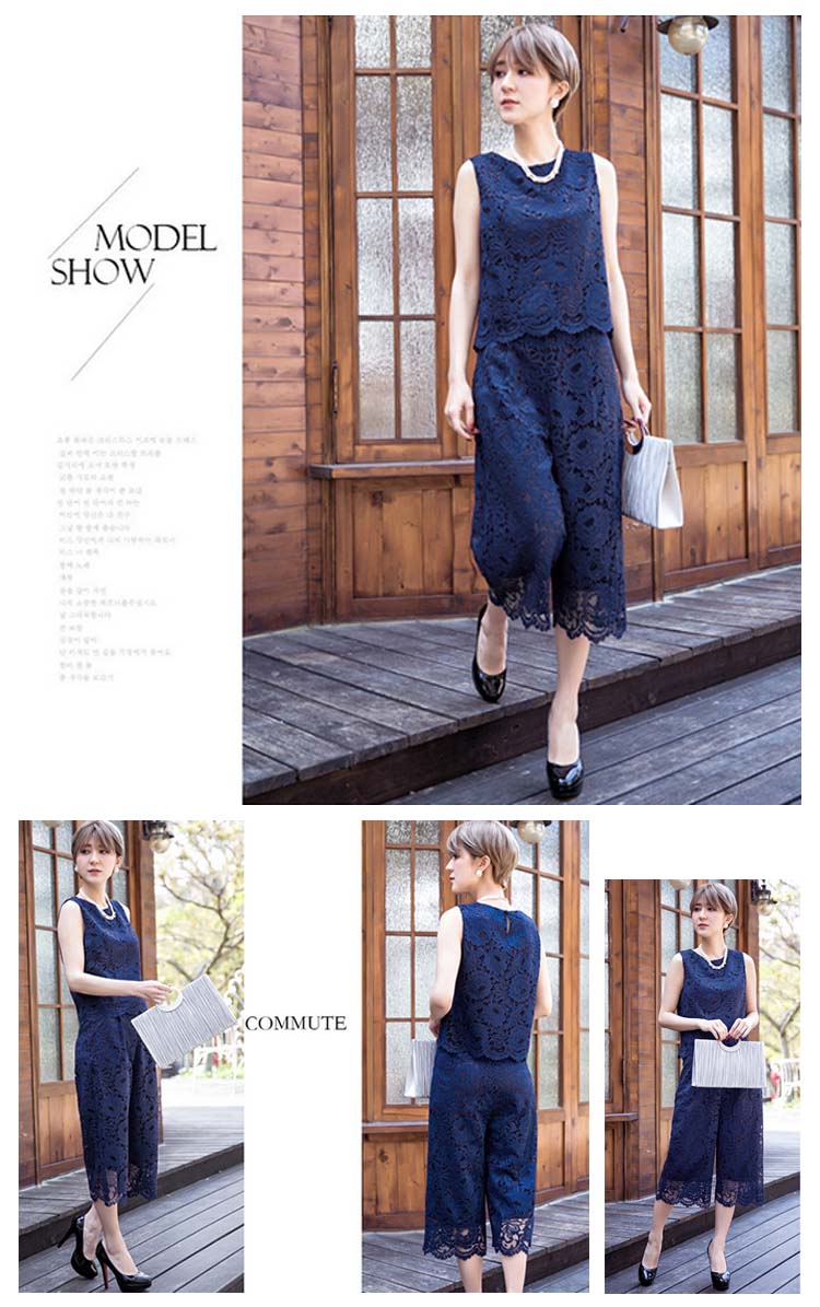 | 上品なレース素材をふんだんに使用したパンツドレス。ノースリーブで今季らしくて爽やかな雰囲気を演出してくれます。ちょっとしたお出掛けや通勤やパーティーなど、特別な日の一着として重宝しそう☆軽いタッチで女度を高め、ラグジュアリーな雰囲気を演出します。 セットアップなので、トップス・パンツだけでも使えるので、シーンを選ばずオシャレを楽しめます。 | |