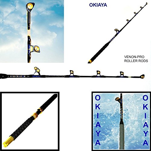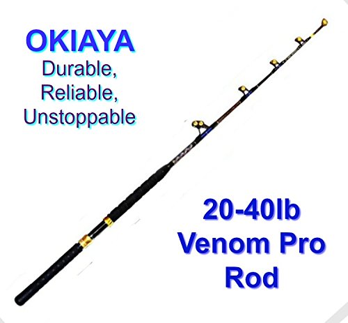 Genuine OKIAYA OFFSHORE VENOM PRO CARBON FIBRE 20-40LB. Class Rod These are black blanks with royal blue and gold trim. All rods individually wrapped in a protective sock with our custom OKIAYA label. FIVE roller guides and 5'6" long for IGFA standup fishing Royal blue and black with gold trim Perfect for offshore trolling and fishing for Dolphin, Wahoo, and Tuna Featuring a classic design with use of CNC machined aircraft grade alloys for strength Composite fiber main shaft for superior sensitivity Super smooth rollers and durable hardware that keeps it looking good Sensitive tip to feel the bite and a real "bull dog" backbone for the fight of your life EVA foam grip and slick butt handle for fast and easy removal. Meets or exceeds all IGFA standards for all big game competitions Overall rod length 1.65M (5'6") OKIAYA rod cover included One piece heavy action Designed in the United States Four roller guides with a roller tip Premium grade Carbon Fiber blank Anodized aluminum reel seat Cross-cut aluminum gimbal butt 100% satisfaction or your money back! 2 Year warranty against any defects! Customer service: 410-463-5326 Worldwide leader in offshore fishing tackle.Feature