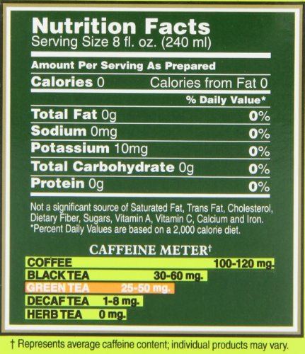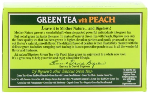 -. Binding : Grocery -. Brand : Bigelow Tea -. EAN : 0072310001305 -. Feature : Pack of six 20-count boxes of calorie-free green tea (120 total tea bags) / Delicate green tea flavored with peach / Gluten free, with no calories and no carbohydrates; Kosher Parve / An excellent source of healthy antioxidants / Ships in Certified Frustration-Free Packaging -. IsAdultProduct : 0 -. Label : Bigelow -. LegalDisclaimer : Actual product packaging and materials may contain more and different information than what is shown on our website. We recommend that you do not rely solely on the information presented and that you always read labels, warnings, and directions before using or consuming a product. -. Manufacturer : Bigelow -. Model : 7231000130 -. MPN : 130 -. NumberOfItems : 6 -. PackageQuantity : 6 -. PartNumber : 130 -. ProductGroup : Grocery -. ProductTypeName : GROCERY -. PublicationDate : 2010-10-13 -. Publisher : Bigelow -. ReleaseDate : 2006-06-22 -. Size : 6 Pack -. Studio : Bigelow -. Title : Bigelow Green Tea with Peach, 20-Count Boxes (Pack of 6) -. UPC : 072310001305