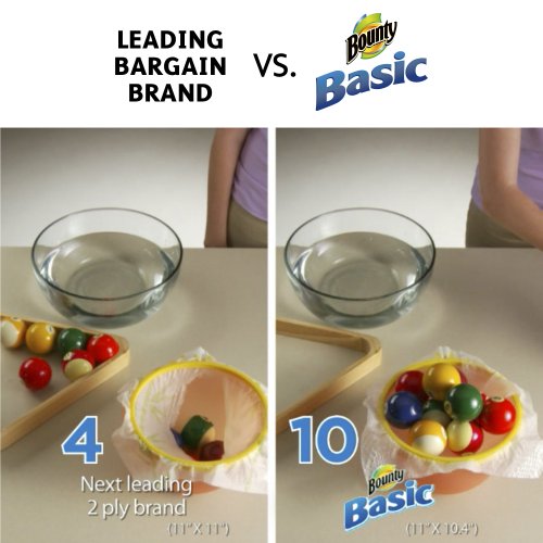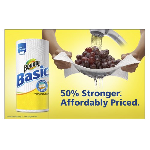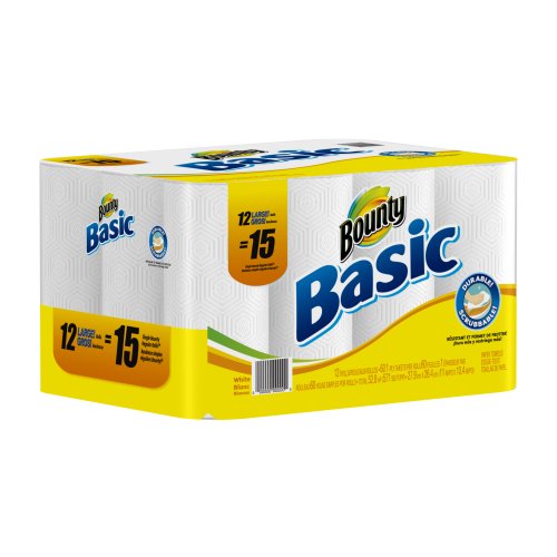 -. Binding : Health and Beauty -. Brand : Bounty -. EAN : 0037000846833 -. Feature : Bounty's Diamond Weave Texture is surP.R.Isingly strong versus the leading bargain brand / Bounty Basic paper towels are 50% Stronger when wet vs. leading 11" x 8.8" bargain brand / Bounty Basic paper towels are affordably P.R.Iced and come in a range of attractive P.R.Ints / Bounty Basic earned the Good Housekeeping Seal of Approval / Equivalent to 15 Regular Rolls / Bounty Basic paper towels are strong enough to stand up to everyday tasks / If you love Bounty paper towels, also try Bounty Quilted Napkins. -. IsAdultProduct : 0 -. Label : Bounty -. Manufacturer : Bounty -. MPN : 3700084680 -. NumberOfItems : 2 -. PackageQuantity : 2 -. PartNumber : 3700084680 -. ProductGroup : Health and Beauty -. ProductTypeName : HEALTH_PERSONAL_CARE -. PublicationDate : 2013-07-30 -. Publisher : Bounty -. ReleaseDate : 2013-02-18 -. Studio : Bounty -. Title : Bounty Basic Paper Towels 12 Large Rolls (Pack of 2) -. UPC : 885344949716