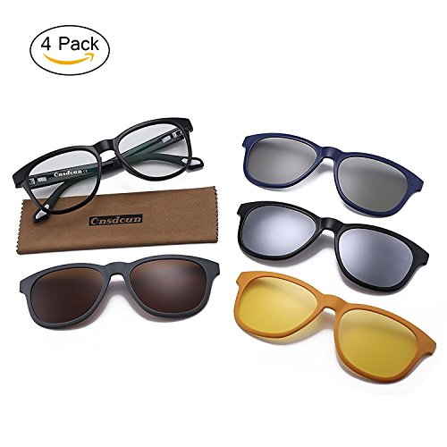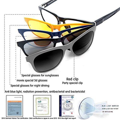 - MULTI–PURPOSE DESIGN- Full rimmed TR90 frame with 1 pair of clear lenses which is antibacterial, and can block more than 98% blue light, maximumly protect eyes from damage, specially in front of the computer. 4 pairs of polarized clip-on lenses, blue for 3D movies, black for outdoor use as shades, grey for fashion, and the yellow for night driving. One purchasing meets multi demands for eyeglasses. As the frame comes with lenses, you can change to prescription lenses at your local optical store.