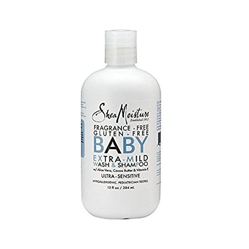 SheaMoisture Fragrance-Free, Gluten-Free Baby Wash and Shampoo. This ever-so-gentle wash and shampoo cleanses without the irritation often caused by synthetic colors or fragrances. The SheaMoisture Baby Extra Mild Wash and Shampoo - 13 Ounce Features: Organic Shea, Cocoa and Mango Butters blend with aloe-vera and vitamin E to hydrate, soothe and heal delicate skin.Feature
