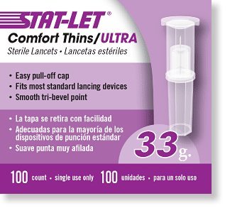 Studio : Stat-Let Publisher : Stat-Let Binding : Health and Beauty Product Description The Comfort Thins/Ultra is one of the thinnest lancets available today. This "ultra-fine" lancet is less painful to use and is ideal for testing that requires smaller volumes of blood. Product Features: Single use only Smooth tri-bevel point Sterile Packaged 100 per box These Substitute for BD Ultra-Fine Lancets 0
