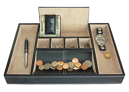 Black Leatherette Valet Tray Desk Dresser Drawer Coin Case Catch-all for Keys, Phone, Jewelry, Watches, and Accessories