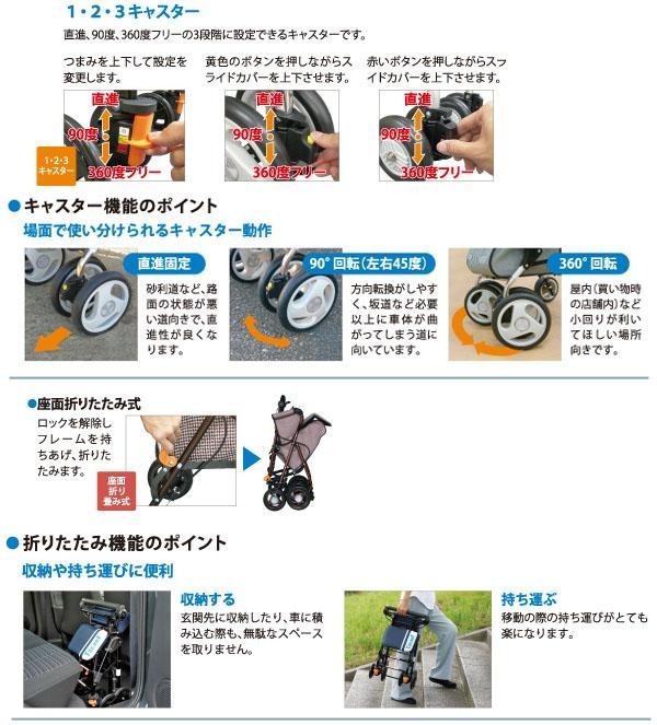 北欧デザインを採用したスタンダードタイプのシルバーカーです。座面下の大容量収納、キャスター式の前輪と大きな後輪による安定性、長時間座っていても疲れにくい幅広座面が特徴です。毎日のお買い物や、お出かけの時に最適です。 |