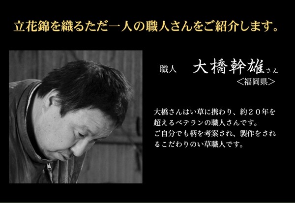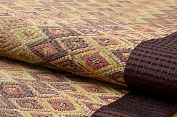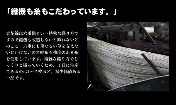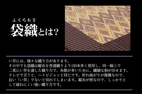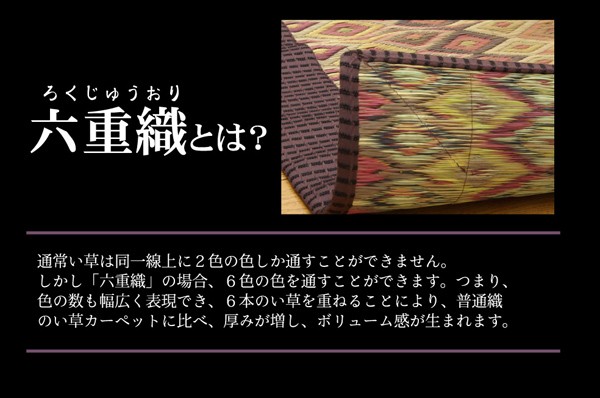 縦糸の本数が多い袋織りという技法で繊細な柄を出しています。折れ曲がりが複雑なので長いイ草を使用しないと切れてしまいます。縦糸が密なので、しっかりとして破れにくいのが特徴です。さらに通常の紋織りの場合2重にイ草を織込むのに対して、6重にイ草を織り込むことで耐久性、ボリューム感、圧倒的な存在感のある商品に仕上げました。本商品を織るに特殊な織機を使用しており、通常の紋織りの約3倍(メーカー調べ)のイ草を使用しますので1日に2枚しか生産が出来ない希少価値のある商品です。生地には国産(九州産)のい草を使用しています。一本一本が太く、表皮が厚く繊維がキメ細かいので弾力性があり、耐久性に優れています。い草には空気の自然浄化作用、湿度の調節作用などがあります。また汚れにくく、使用するうちに黄金色に変化し味が出ます。い草に青森ヒバ加工を施しています。(抗菌、防臭効果)