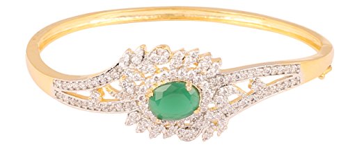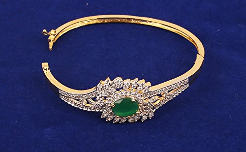 Brass base marvelous and exclusive filigree designer bracelet, embedded with cubic zirconia and oval shape faux ruby in gold and silver tones. For Perfect Matching, search for TOUCHSTONE BANGLES.